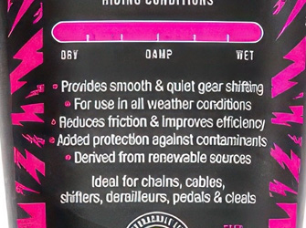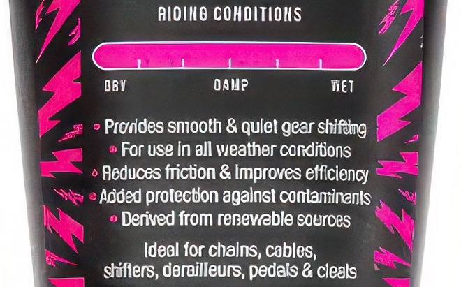 Smörjmedlets vattenavvisande, icke-flytande formula tränger djupt in i kedjelänkarna. Det bildar en skyddande beläggning som skyddar mot korrosion och metall-till-metall-slitage. En blandning av tillsatser för extrema tryck säkerställer att smörjmedlet klarar tuffa körförhållanden. Produkten kan appliceras på kedjor, kablar, växlar, växelspakar, pedaler och klossar.