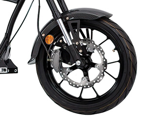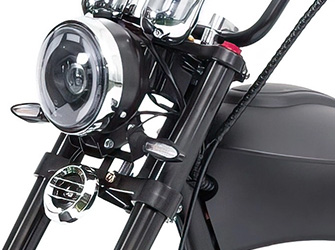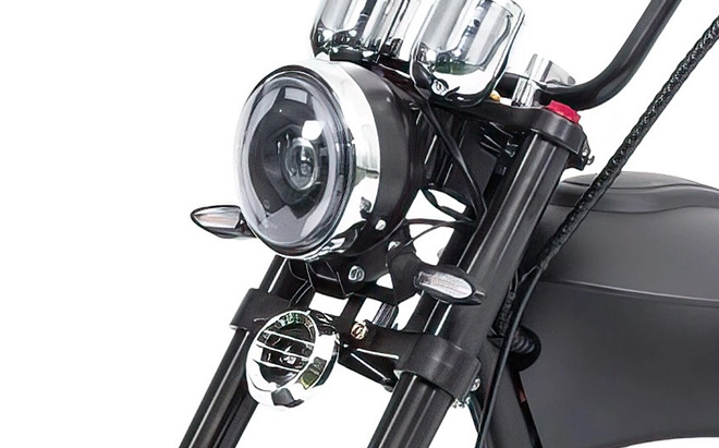 Ampride Chopper tar säkerheten på allvar. Den hydrauliskt fjädrade gaffeln utlovar en mjuk körning och absorberar alla stötar och skakningar.