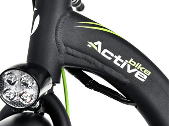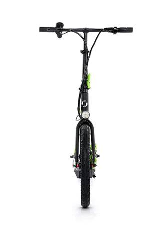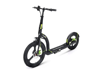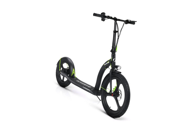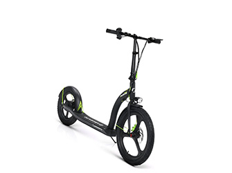 Alla komponenter arbetar tillsammans för användarens komfort. Den kompakta storleken underlättar praktisk förvaring. En bred plattform med en halkskyddsmatta gör att fötterna står stadigt under cykelturen. De gröna elementen i det svarta färgschemat ger en intressant twist till den klassiska looken.