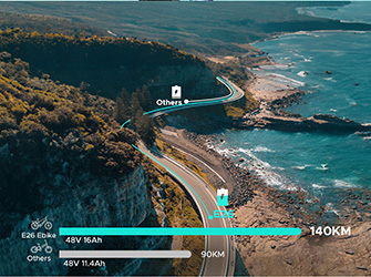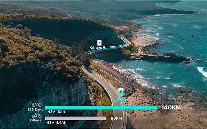 ENGWE E26 är utrustad med ett 48V 16Ah litiumbatteri. Det ger en imponerande räckvidd på upp till 63 km (39 mi) i enbart eldrift. I pedalassistansläget ökar räckvidden till hela 140 km, vilket gör den idealisk för långa resor utan att behöva oroa sig för att få slut på ström.