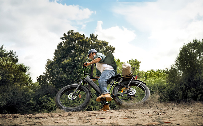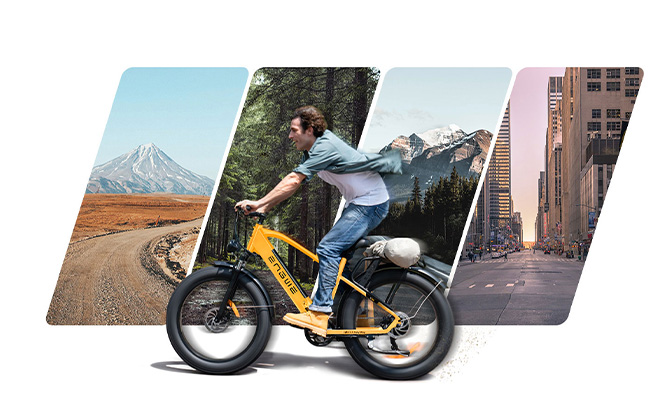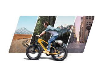 De 26" x 4,0" feta däcken och det dubbla fjädringssystemet ger utmärkt grepp och stabilitet i olika terränger, inklusive snö, sand och grus, vilket ger en smidig och anpassningsbar körning.