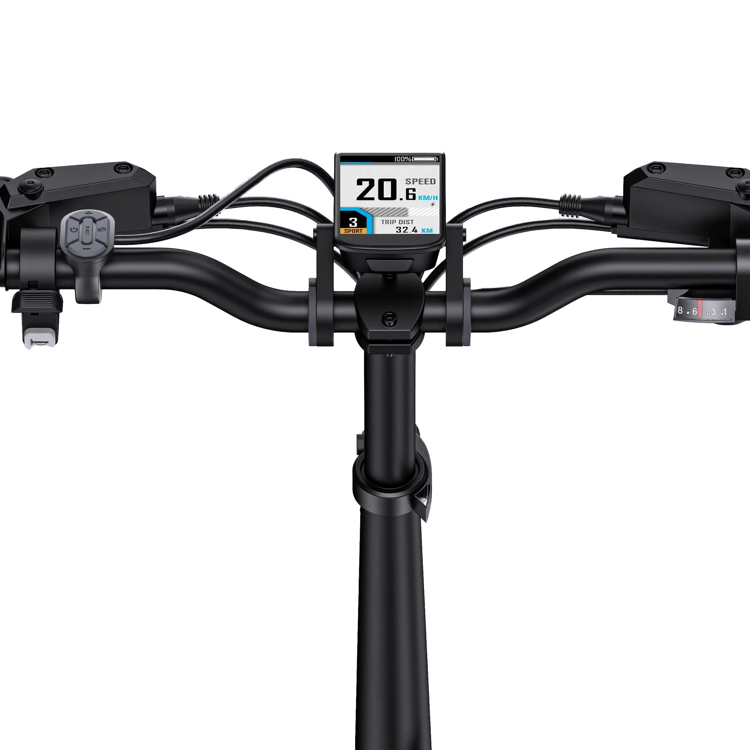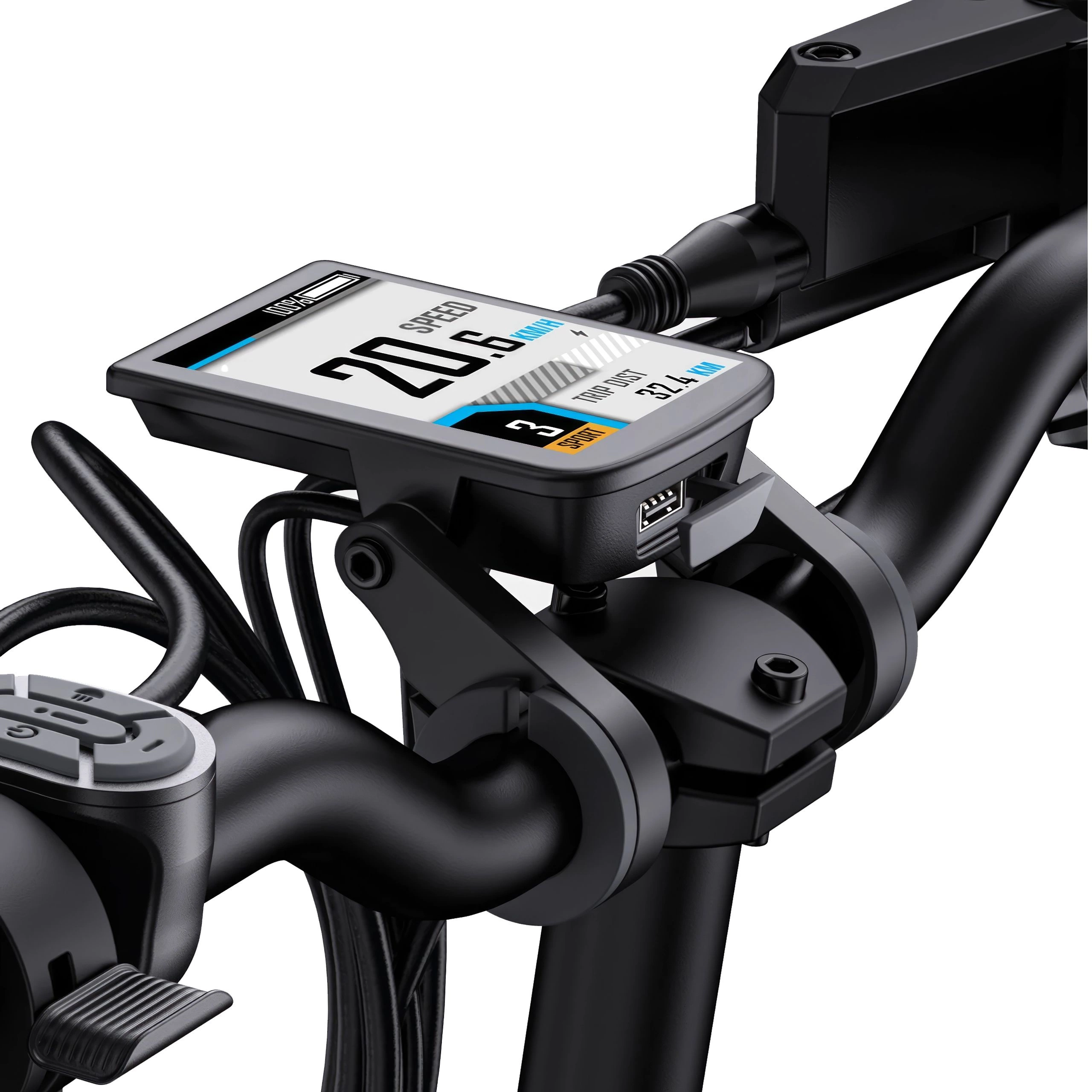 Cykelns LCD-display visar realtidsdata som hastighet, tillryggalagd sträcka och batterinivå. Du kan också välja körläge och justera effektnivåerna. Med den här displayen kan du övervaka och hantera din cykeltur på ett mer effektivt sätt.