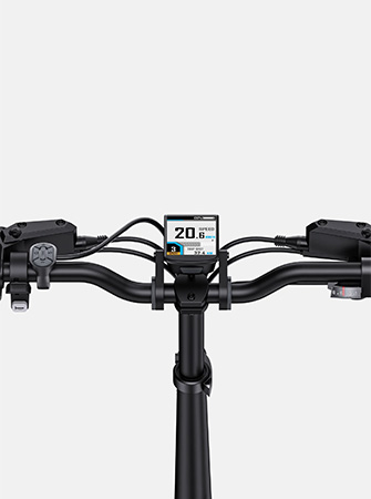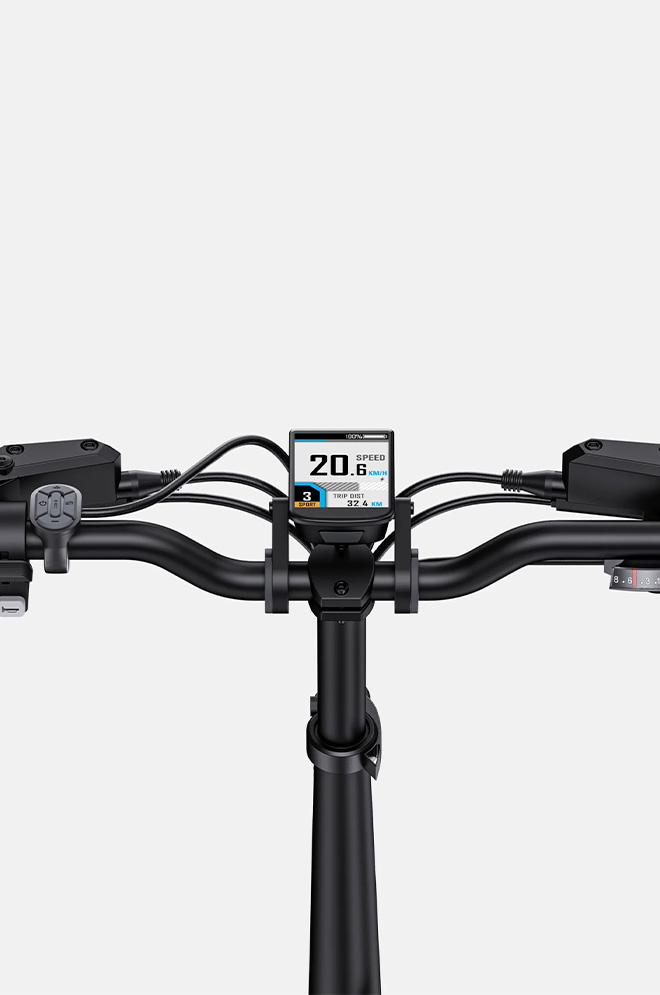 Cykelns LCD-display visar realtidsdata som hastighet, tillryggalagd sträcka och batterinivå. Du kan också välja körläge och justera effektnivåerna. Med den här displayen kan du övervaka och hantera din cykeltur på ett mer effektivt sätt.