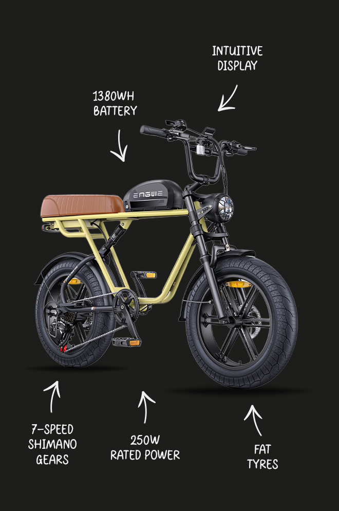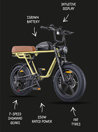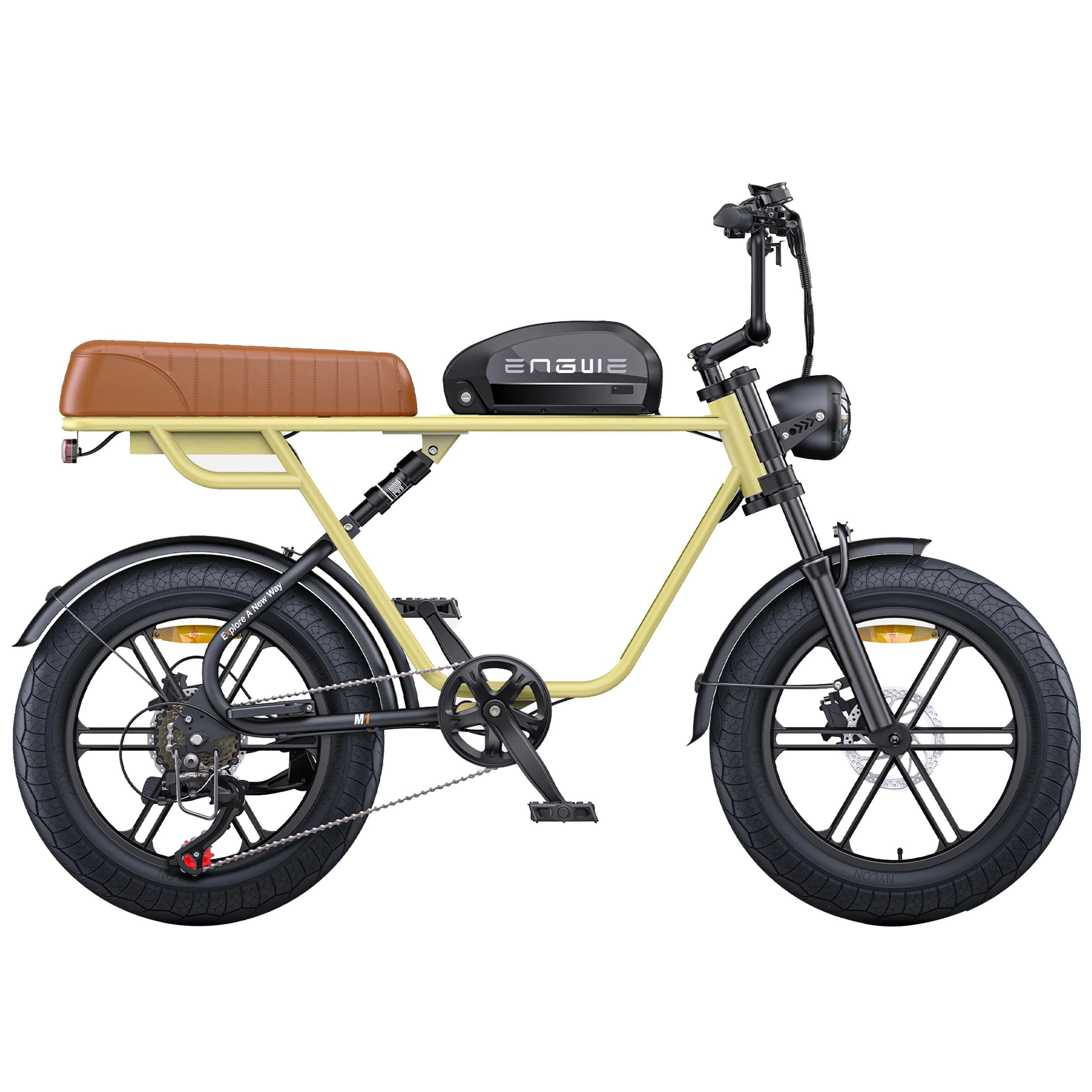 ENGWE M1 elcykel kombinerar en kompakt design med imponerande räckvidd. Denna elcykel med två passagerare har en 250 W-motor i en miniram som är byggd för stadslivet. Den har en imponerande räckvidd på 170 km och en bekväm sittplats för två personer. Den är perfekt för dem som vill dela sin resa eller behöver extra lastutrymme.