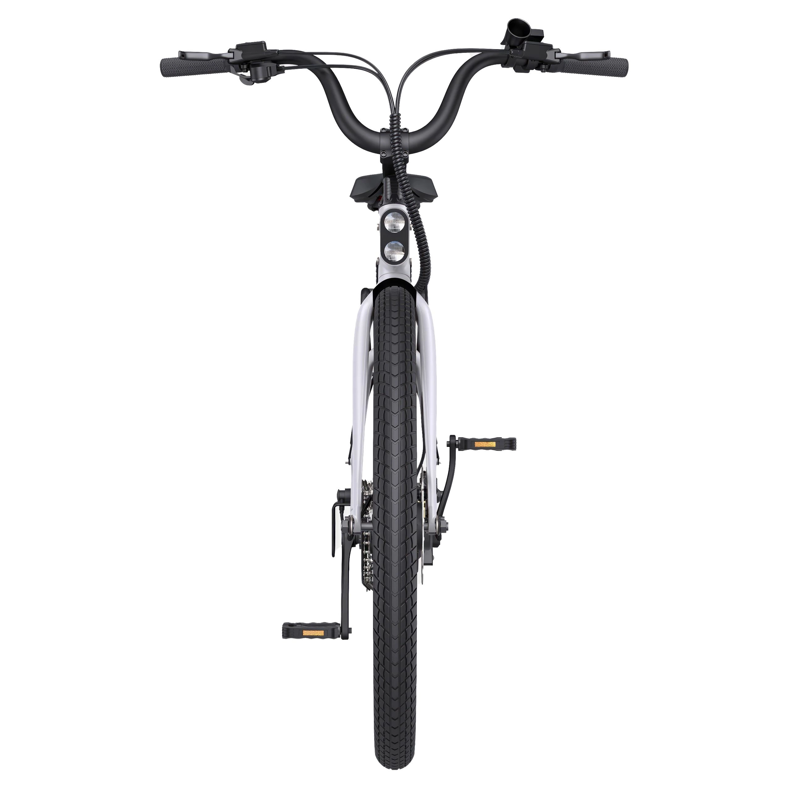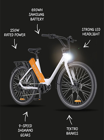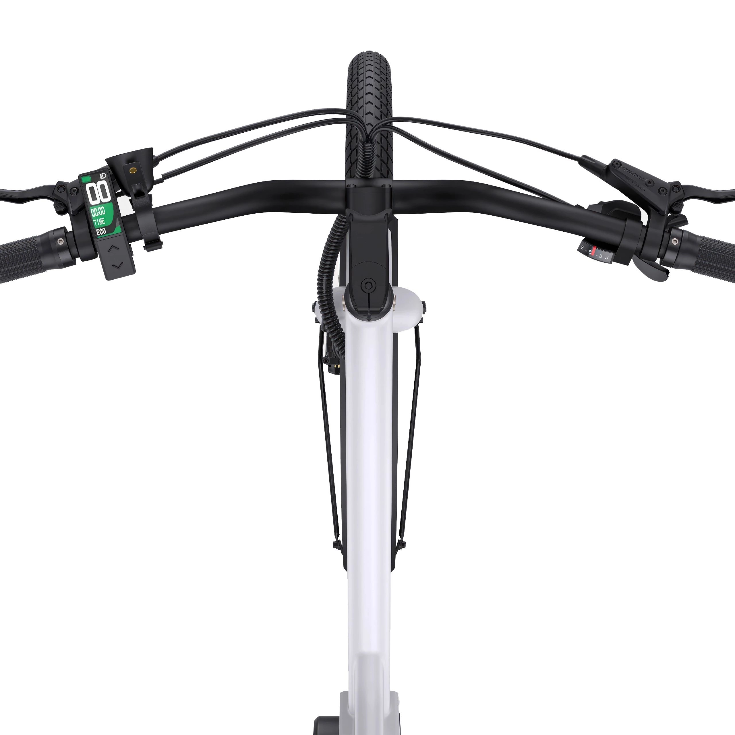 Den genomgående ramen gör det enkelt att montera på och av cykeln, vilket gör den idealisk för användare i alla åldrar. Det breda kohornsstyret, den upprätta körställningen och den bekväma sadeln ger en stabil och behaglig pendlingsupplevelse, även under längre turer.