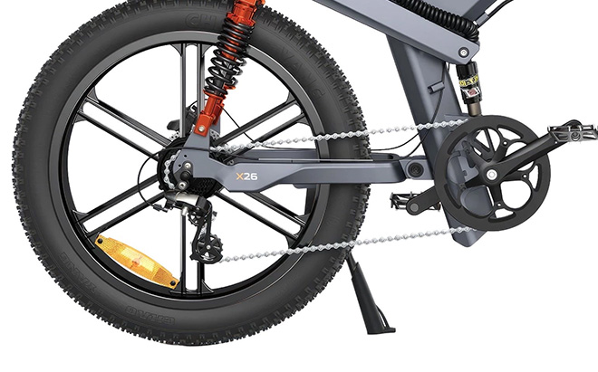 ENGWE X26 elcykel har ett trippelfjädringssystem som inkluderar en hydraulisk framgaffel, en mekanisk mellanstötdämpare och en pneumatisk bakre stötdämpare. Denna inställning säkerställer att du får en smidig körning, eftersom den absorberar alla stötar och stötar från grov terräng.