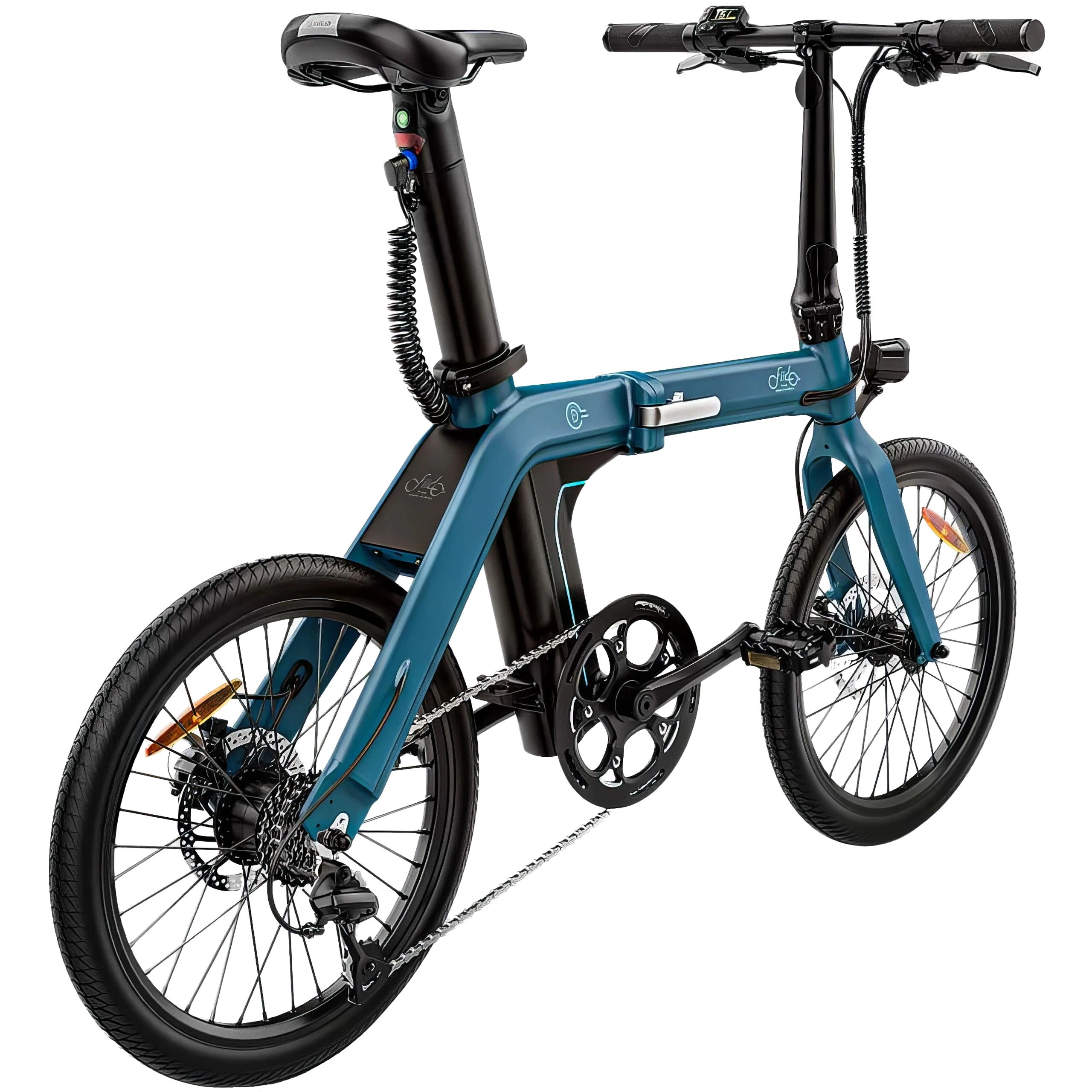 Fiido D11 kommer i en iögonfallande blågrön färg med en unik M-formad ram. Batteriet är dolt i sadelstolpen för att hålla det snyggt. Svart sadel, styre och bromsar skapar en perfekt kontrast. De 20-tums hjulen med smala däck ger den ett sportigt utseende . Även när den är hopfälld ser cykeln bra ut.