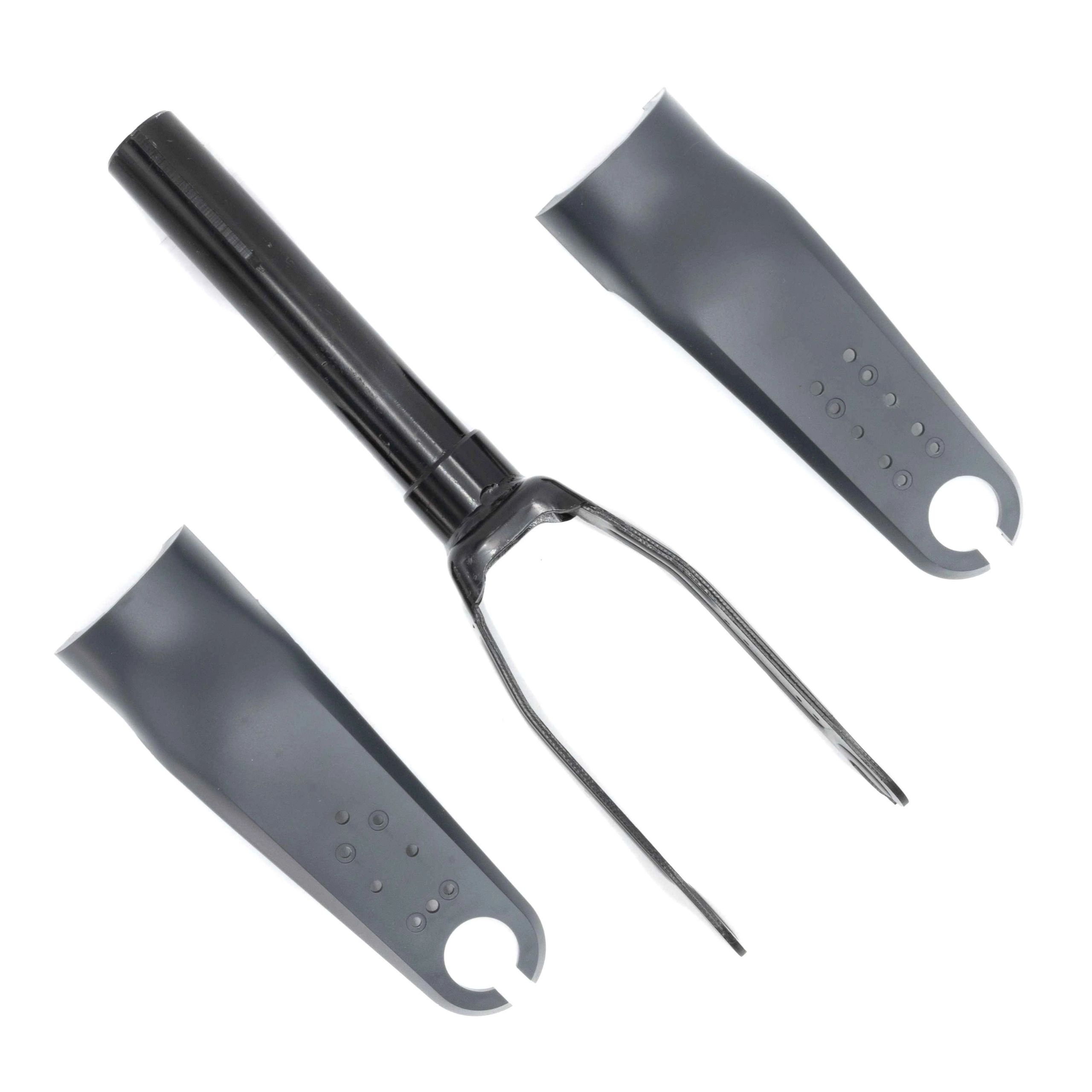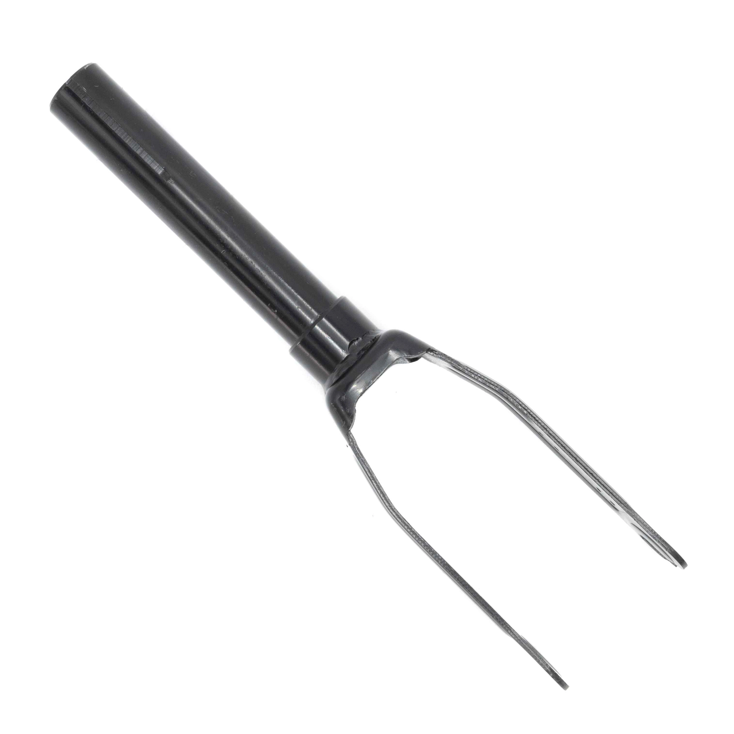 Gaffeln absorberar stötar från ojämn terräng. Den påverkar hur elektrisk skoter navigerar över trottoarkanter och gropar. Delen är utformad för att röra sig och reagera på hjulens svängningar.