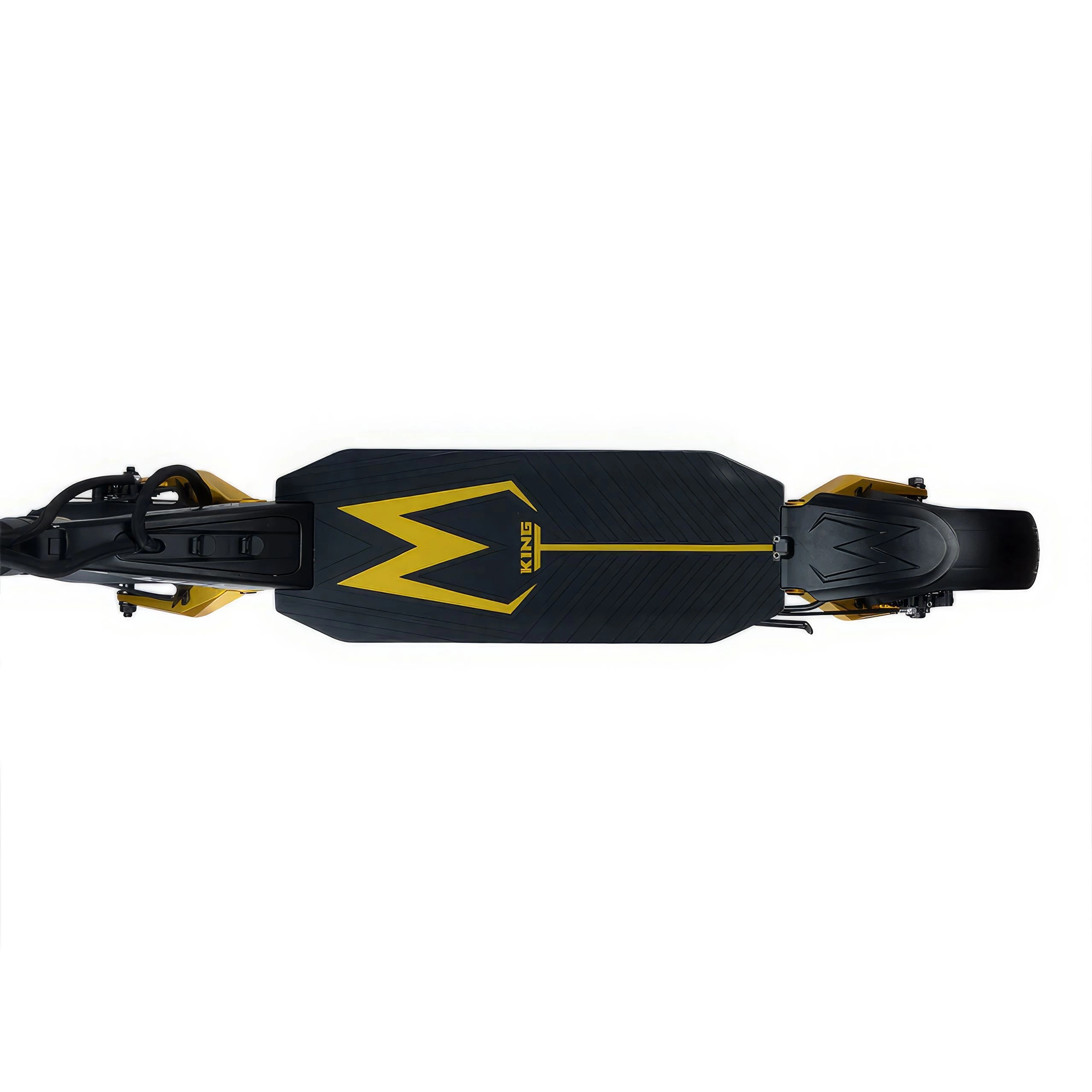 Mantis King GT har en snygg, mer diskret profil med en iögonfallande framdel och bakre svängarm. elektrisk skoter är utrustad med dubbla 10" x 3" hybriddäck på delade fälgar och justerbar hydraulisk fjädring, vilket ger en jämnare körning på ojämna underlag. Det 23" x 8,5" dubbelfärgade plattform ger också gott om utrymme för användare att byta position bekvämt under långa turer
