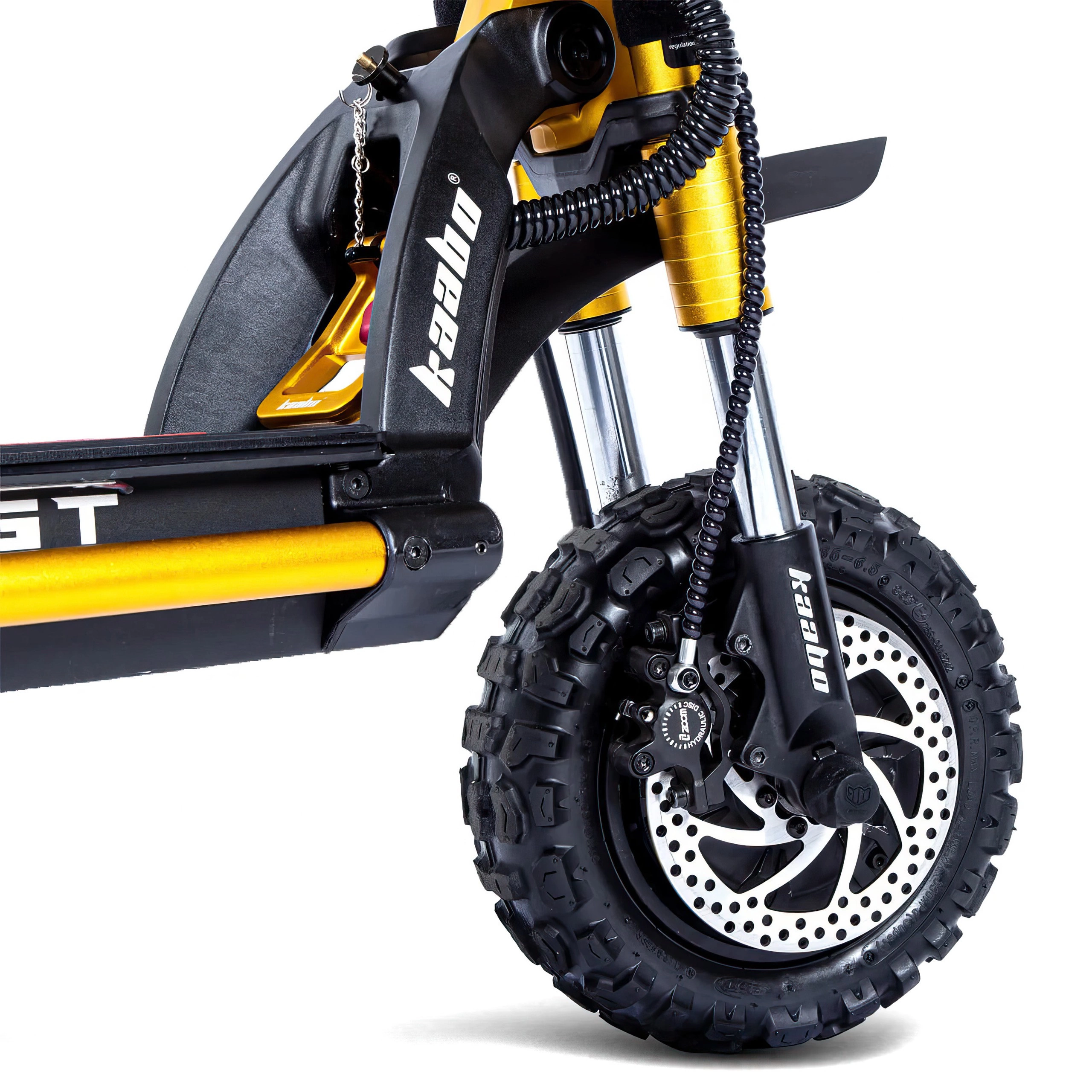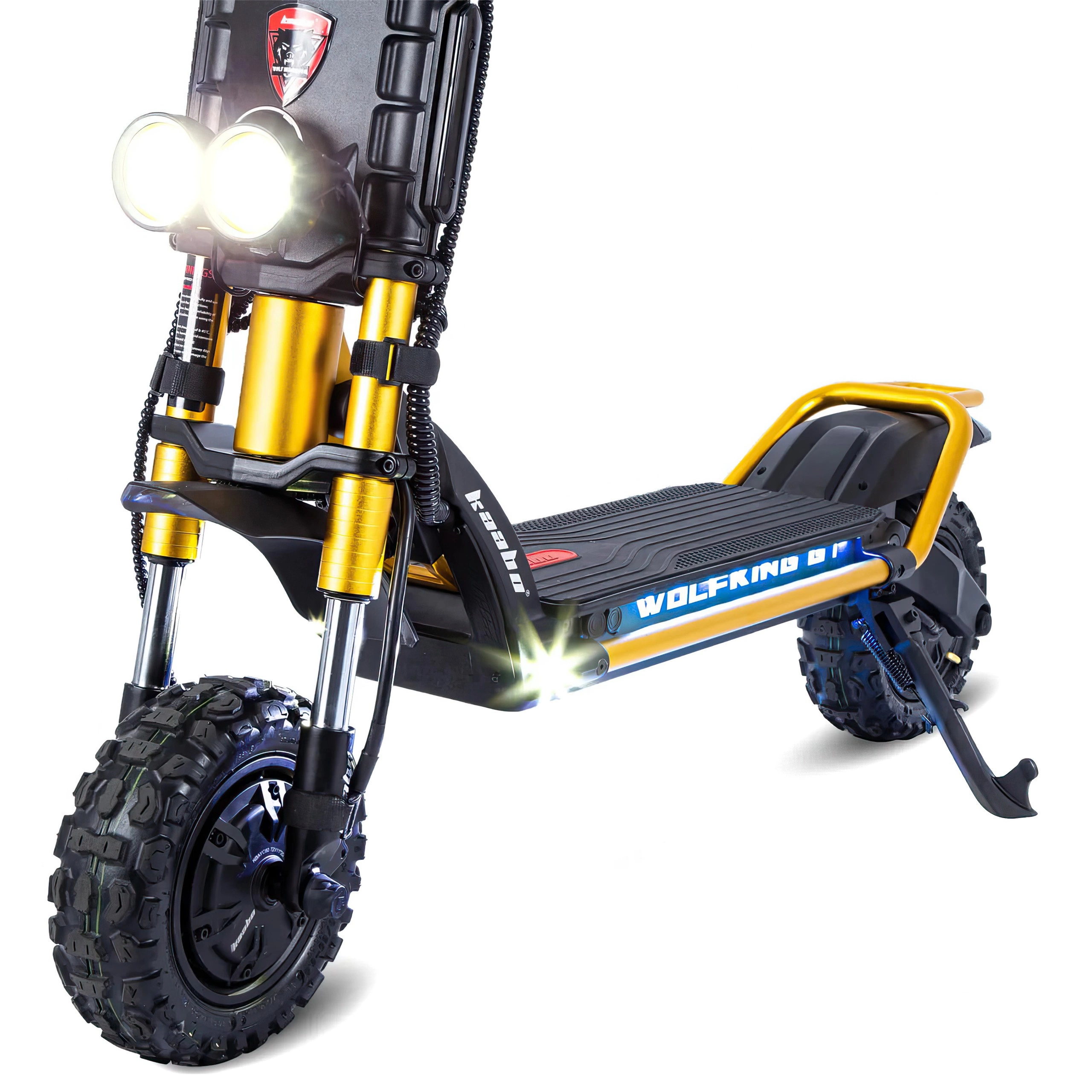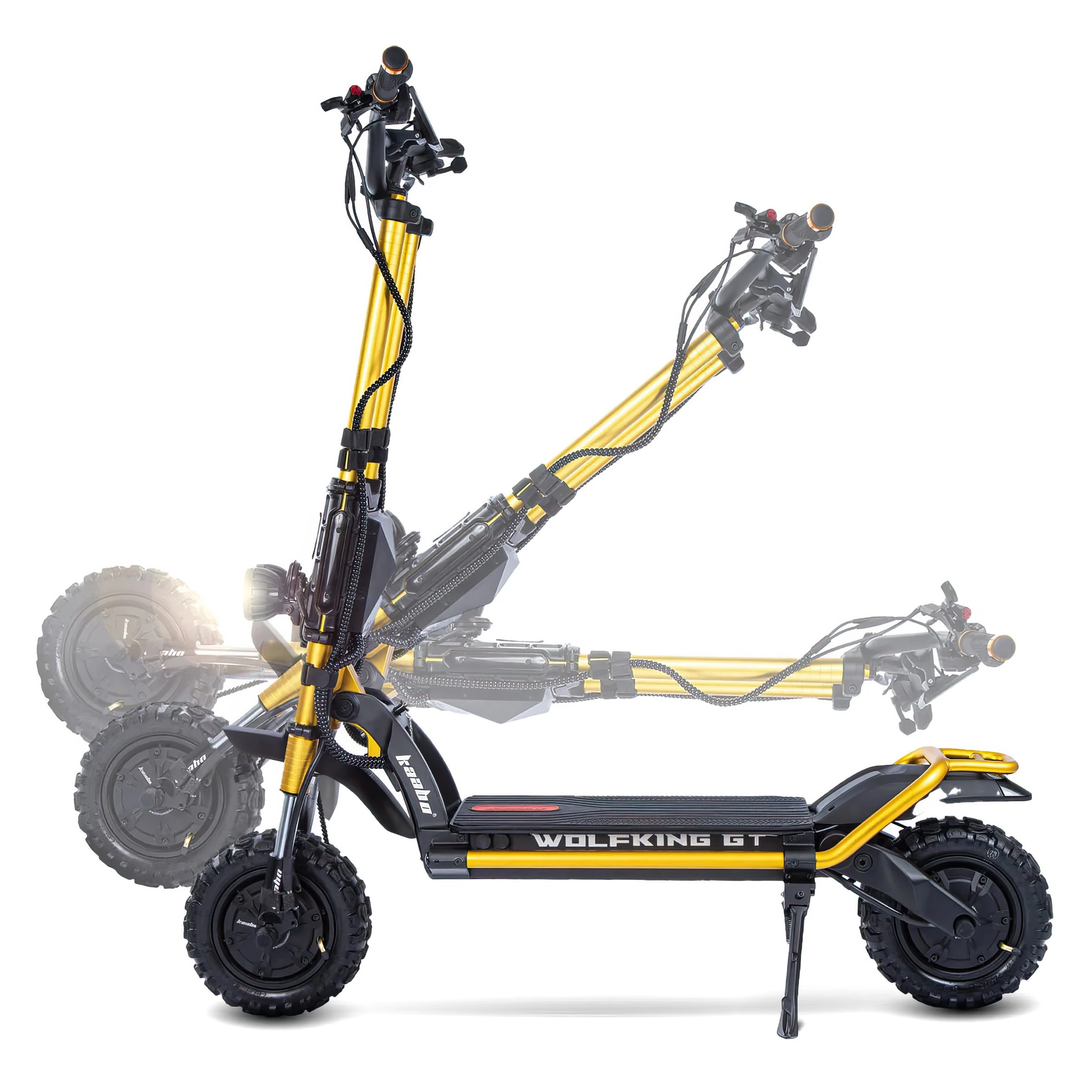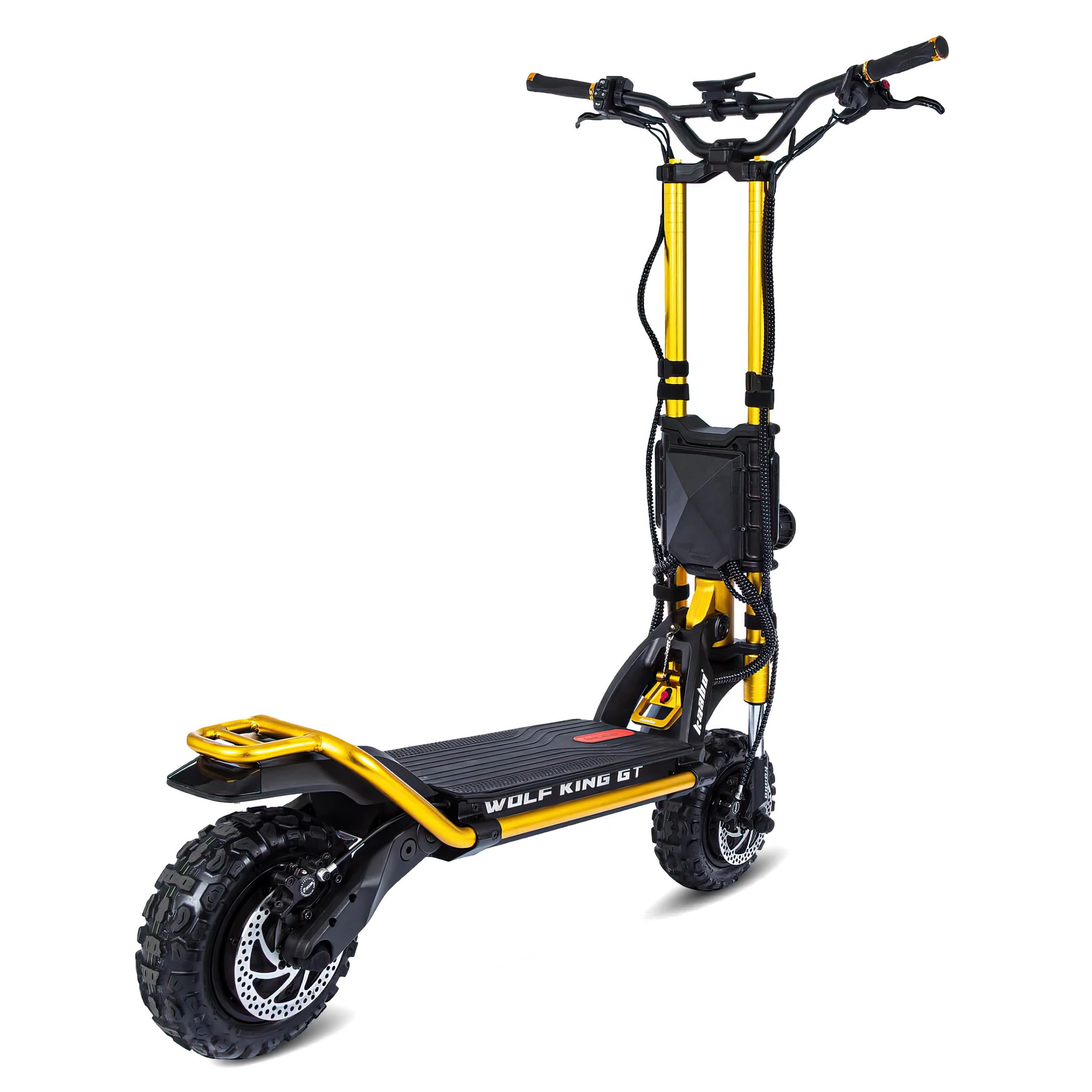 Kaabo Wolf King GT Pro är en kung på både spår och stigar. Detta kraftfulla fordon når en topphastighet på upp till 100 km/h (62mph) tack vare sina dubbla 2000W-motorer. Den har till och med vunnit utmärkelsen Speed Champion i ESG 2022-23. elektrisk skoter ger ett utmärkt vridmoment för terrängkörning och branta backar.