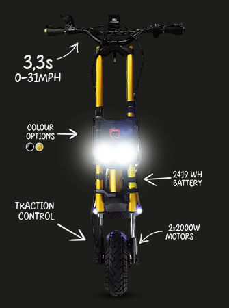 Denna elektriska elektrisk skoter är utrustad med dubbla 2000W-motorer med en toppeffekt på 13440W och kan nå en hisnande topphastighet på 100+ km/h (62+ mph) och erbjuder en omfattande räckvidd på upp till 180 km (112 miles).