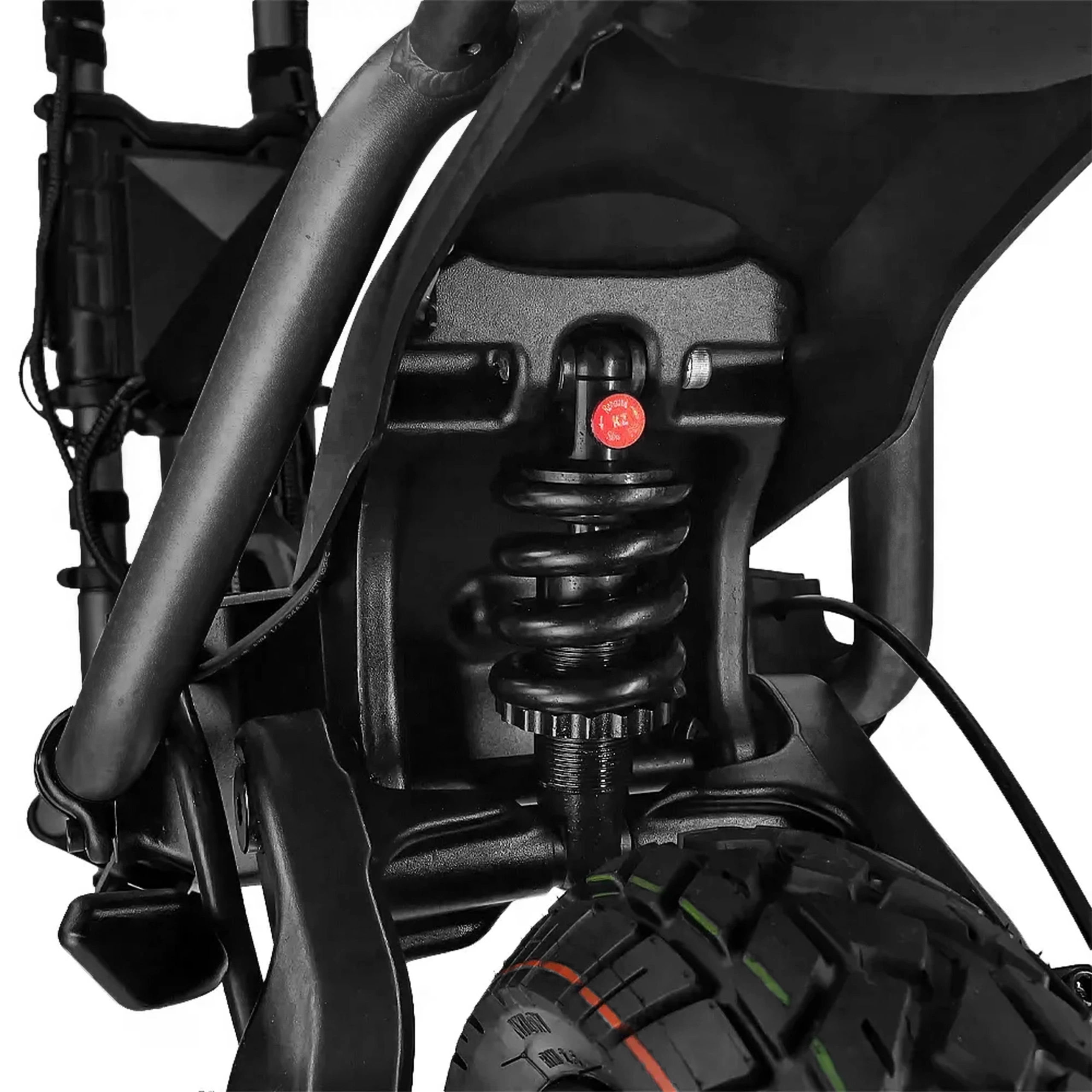 elektrisk skoter:s banbrytande hydrauliska fjädringssystem, kompletterat med 110° styrning, ger en sömlöst smidig körning även i de mest utmanande terrängerna. Den minskar avsevärt förare trötthet genom att absorbera stötar och vibrationer.