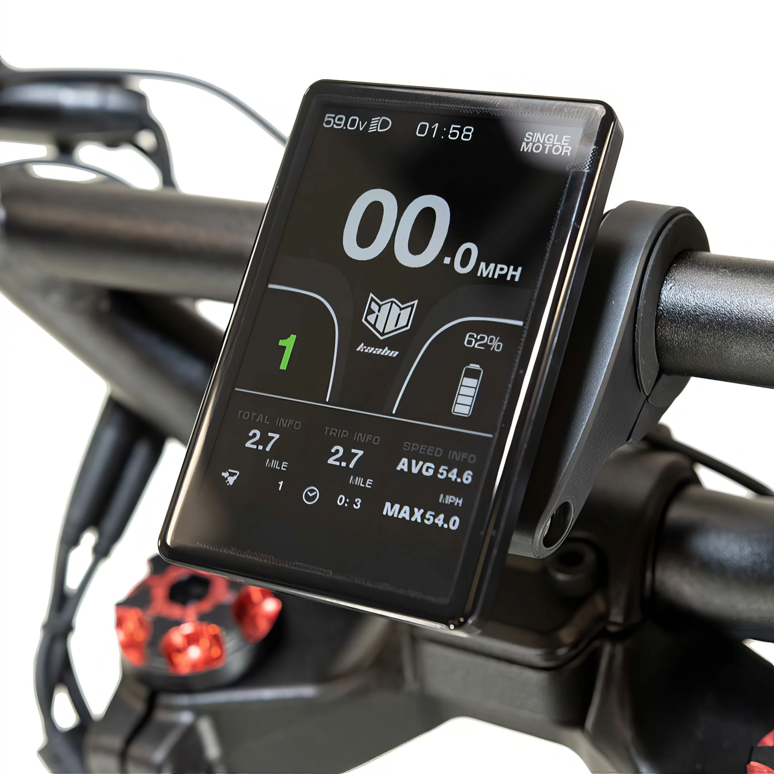 Kaabo Wolf Warrior X GT har en 4,2" TFT-display med antireflexbehandling som sätter nya standarder för förare gränssnitt. Den är mycket större än konventionella displayer och ger tydlig och enkel åtkomst till viktig information om cyklingen. Displayen är centralt placerad på styret och gör det möjligt att enkelt övervaka hastighet, batteristatus och andra viktiga data.