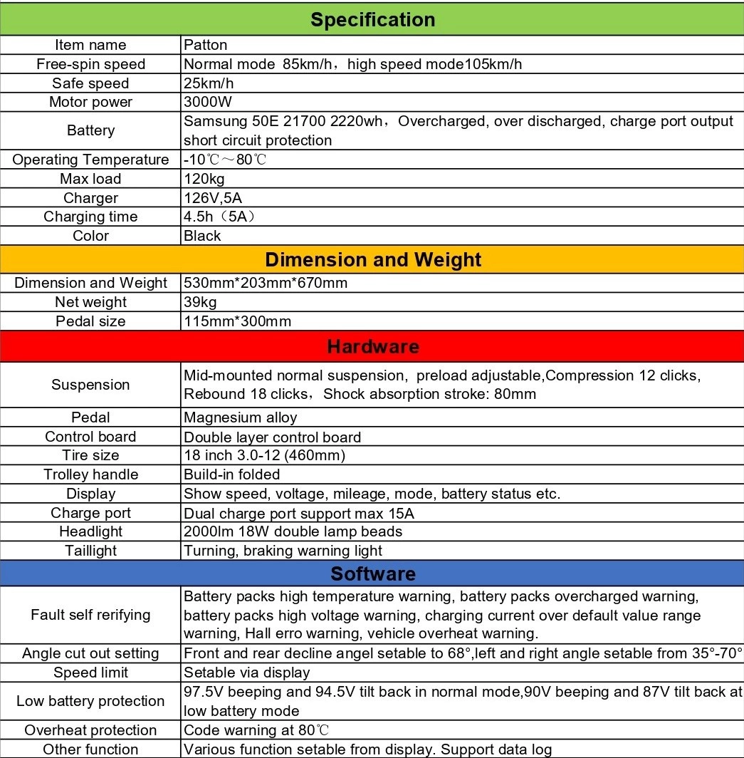 Upplev oöverträffad prestanda med Leaperkim Pattons 3000W-motor, som kan driva dig till nya hastighetshöjder. Den inbyggda hastighetsbegränsaren säkerställer att du kan njuta av spännande åkturer utan att kompromissa med säkerheten, vilket gör den idealisk för både adrenalinjunkies och säkerhetsmedvetna användare. Fordonets sofistikerade övervakningssystem ger feedback i realtid om hastighet, spänning och körsträcka, och allt visas på en tydlig och omfattande panel-tavla
