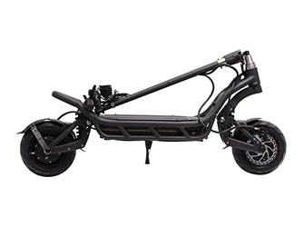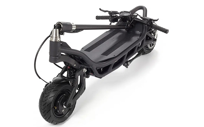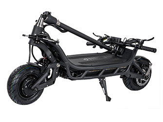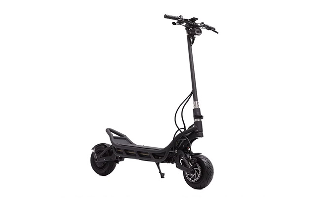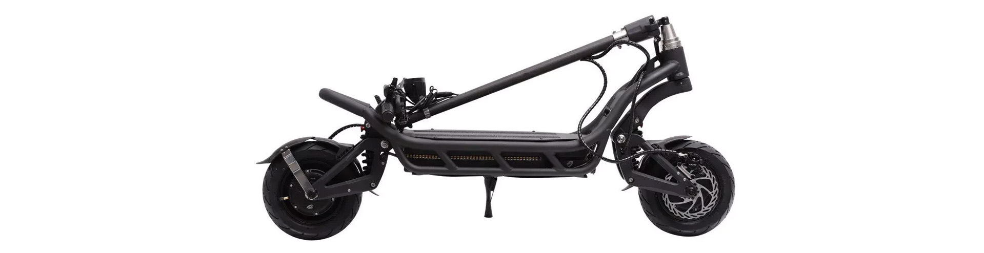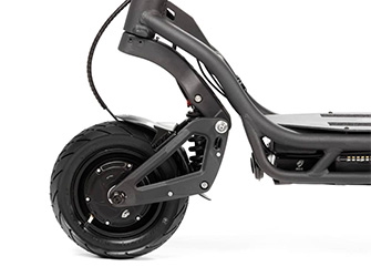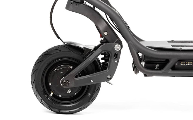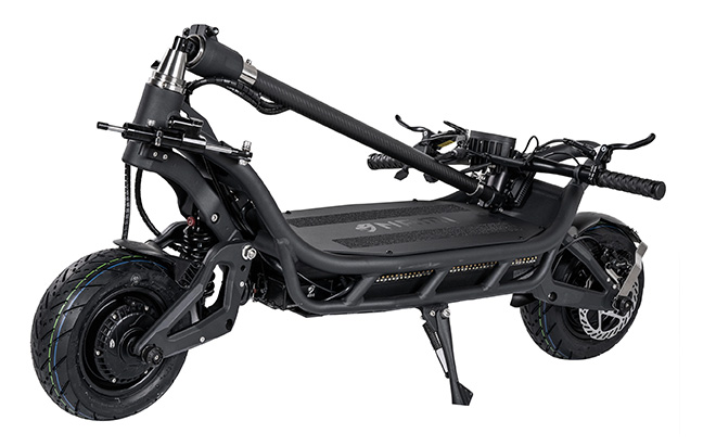 En perfekt blandning av kolfiber och flygklassad aluminium, i kombination med en vickningsfri vikmekanism och IP55-klassning, garanterar denna elektrisk skoter:s robusthet. Komforten är det inget fel på, med justerbar hydraulisk spiralfjädring, slanglösa däck och extra brett styre, vilket ger en smidig åktur i varierande terräng.