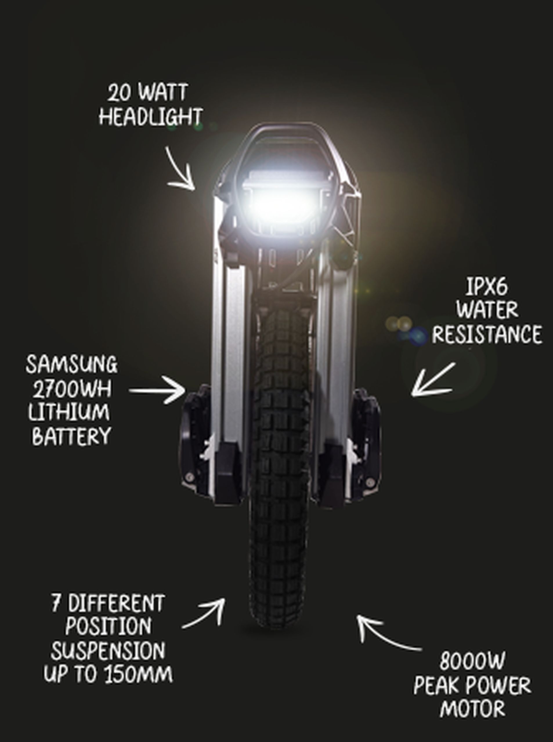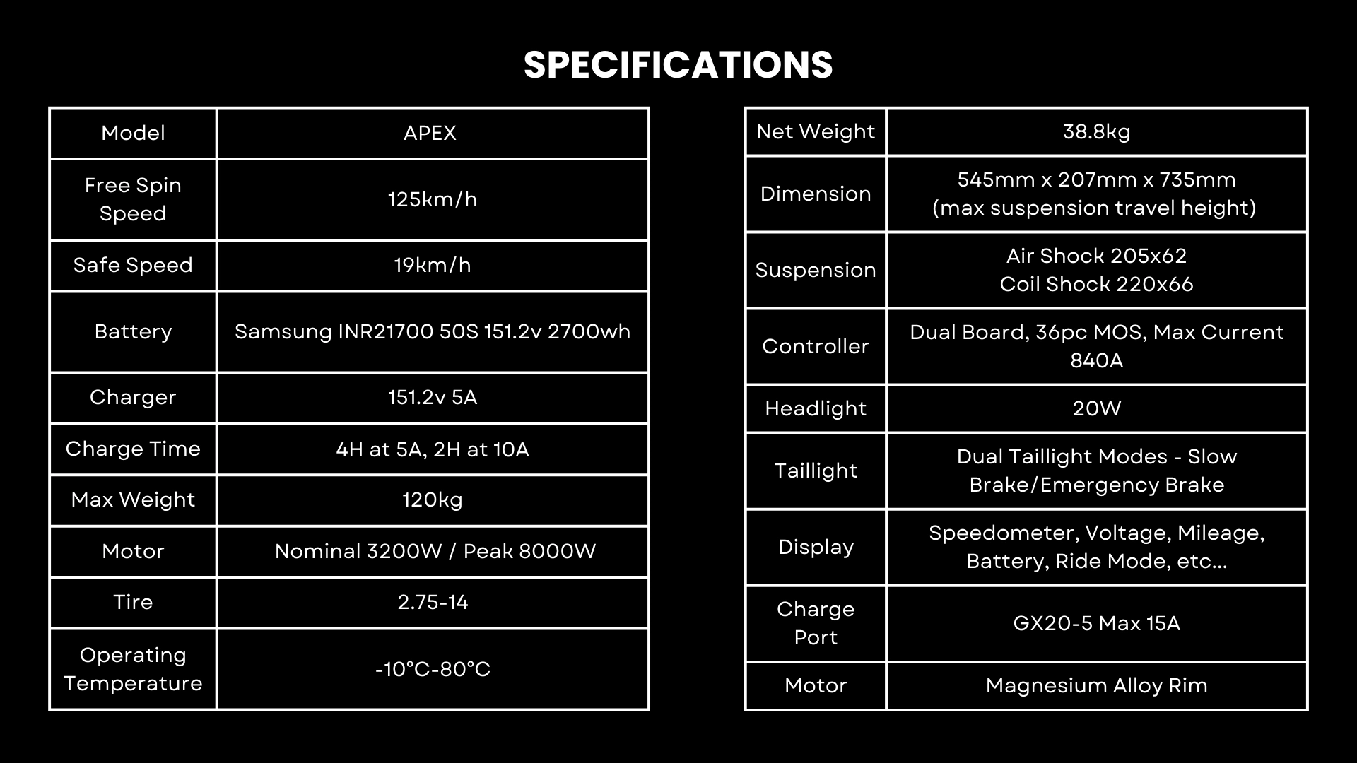 Apex 50S har en kraftfull motor på 3200 W som kan nå en toppeffekt på 8000 W. Detta kraftpaket kan driva dig uppför branta backar och genom ojämn terräng som skulle stoppa mindre hjul i sina spår. Med en topphastighet på 77 mph (125 km/h; men vi rekommenderar inte att du testar det!) har du mer än tillräckligt med fart för alla situationer.
