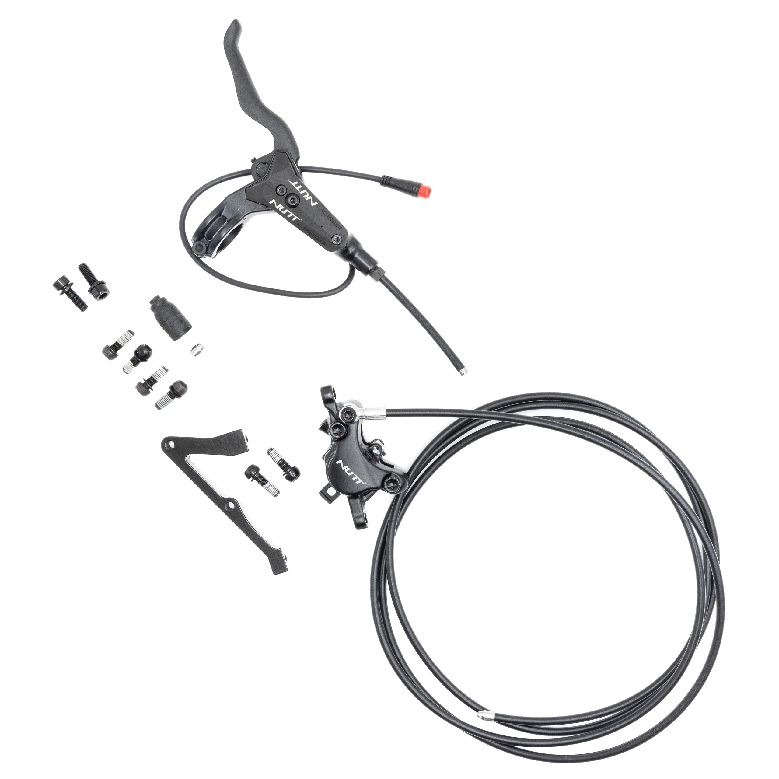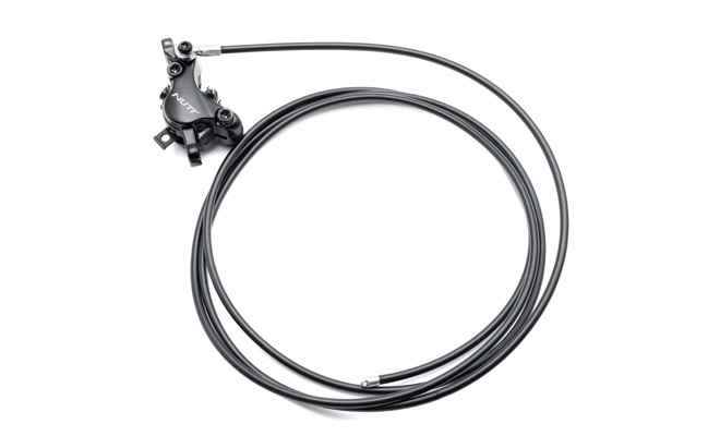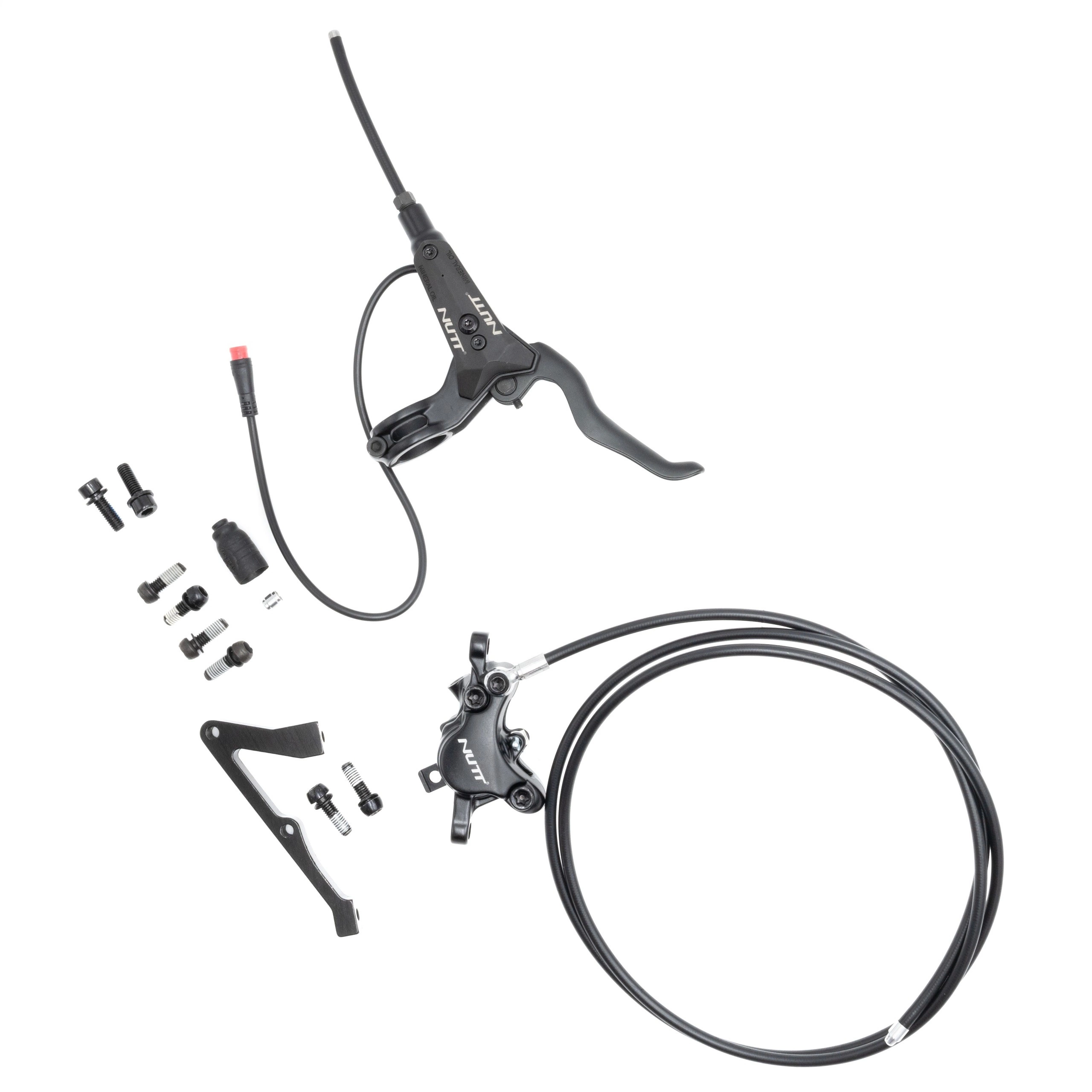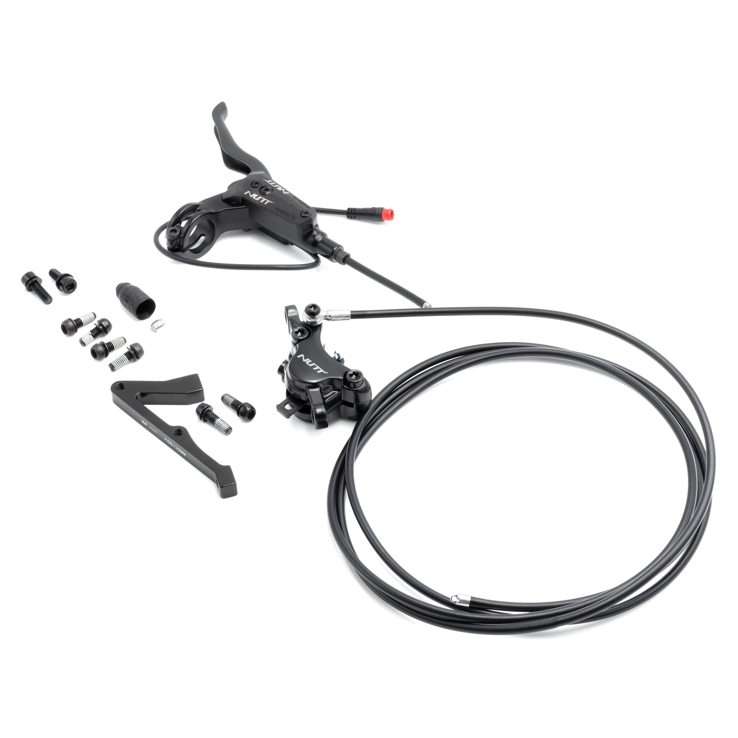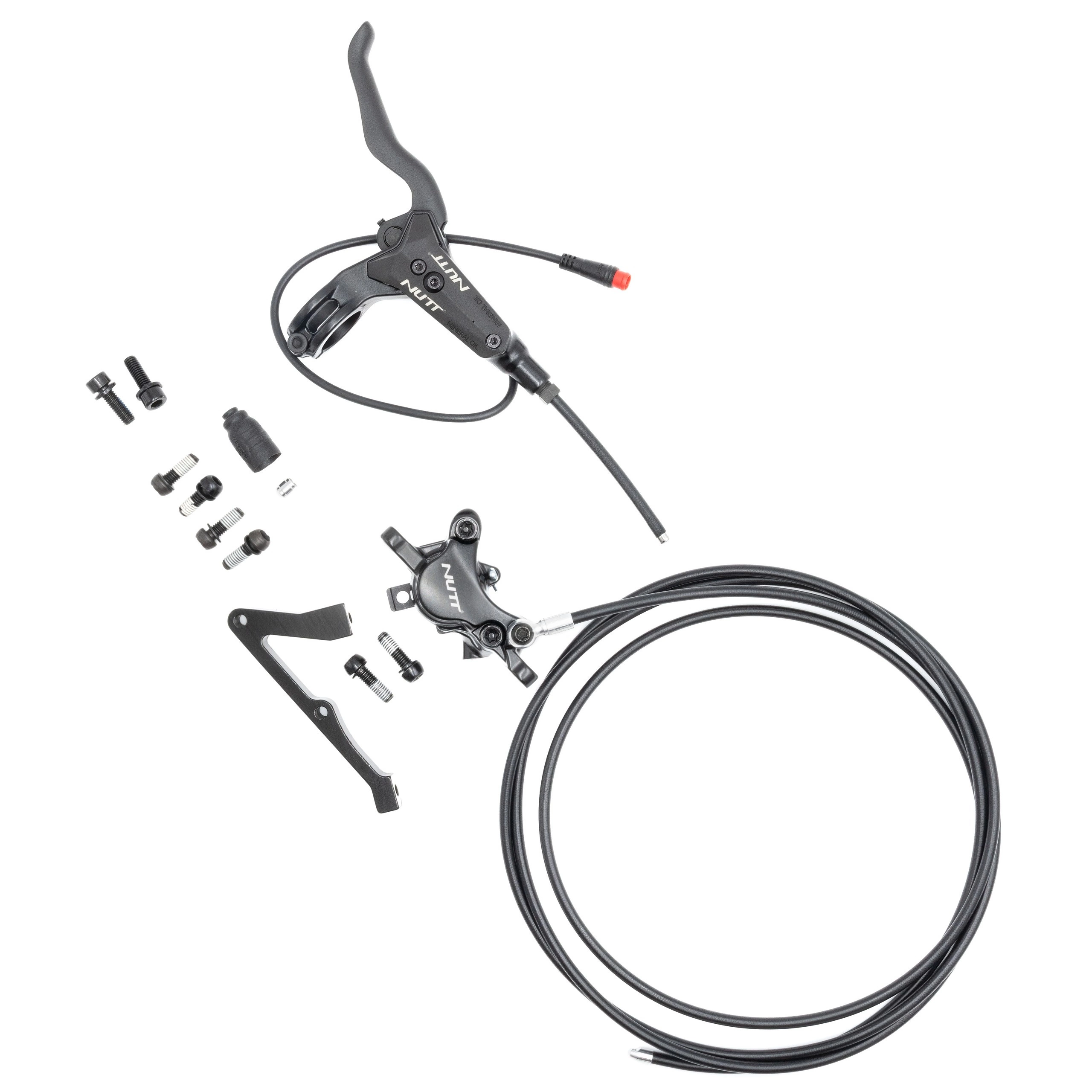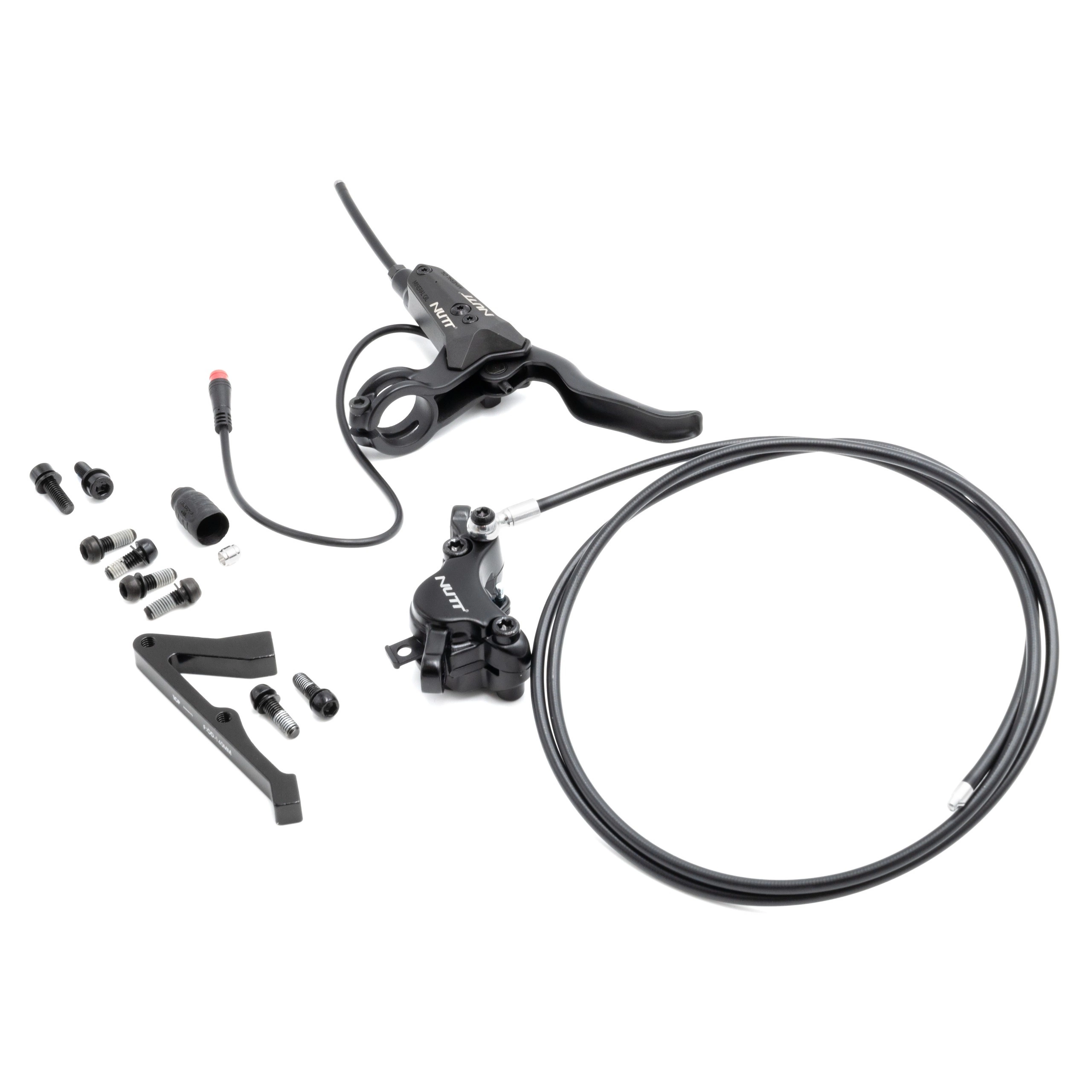 Du får en installationsklar uppsättning med ett hydrauliskt bromsok och en bromsledning från Nutt, en bromsspak med sensor och ett blockfäste för bromsfäste.