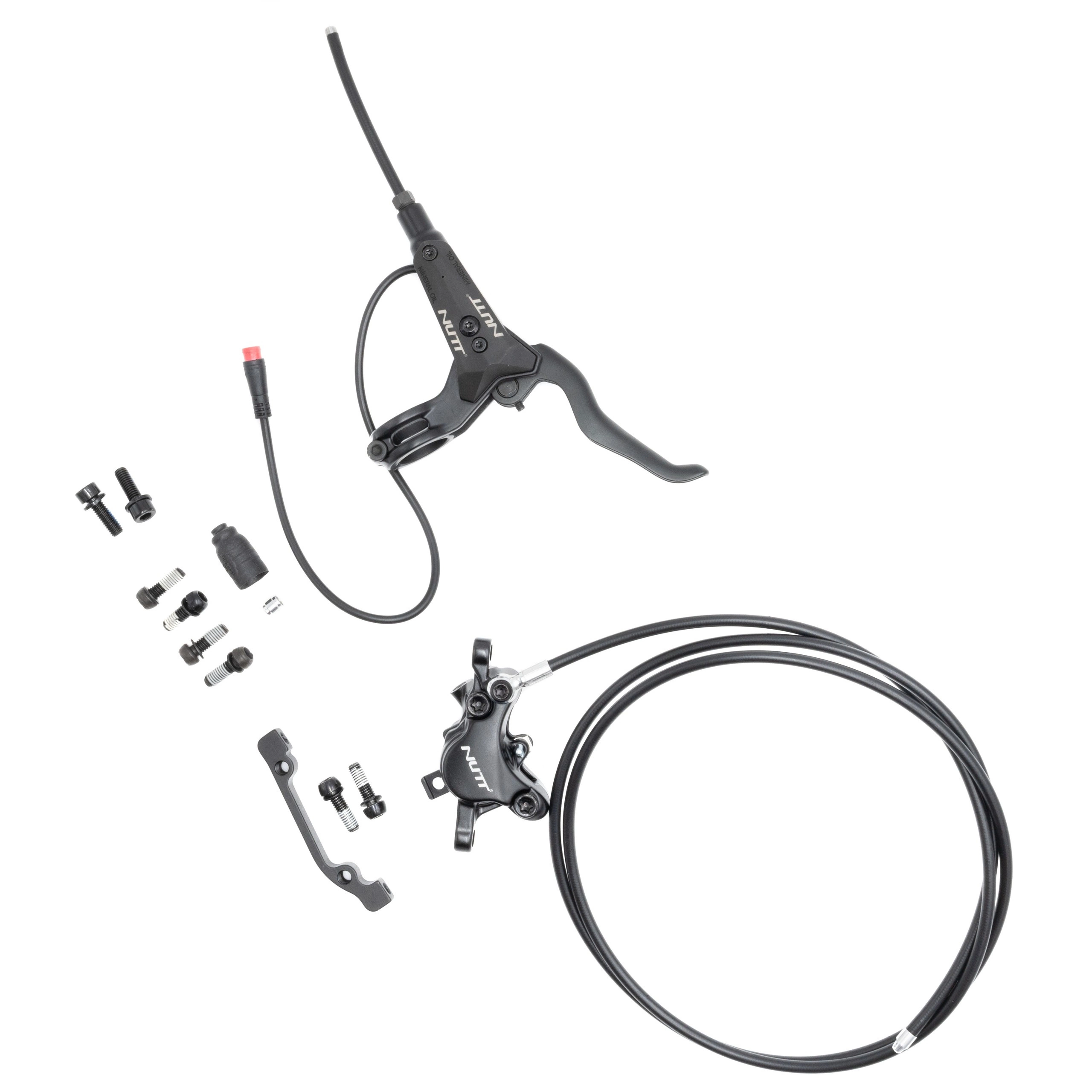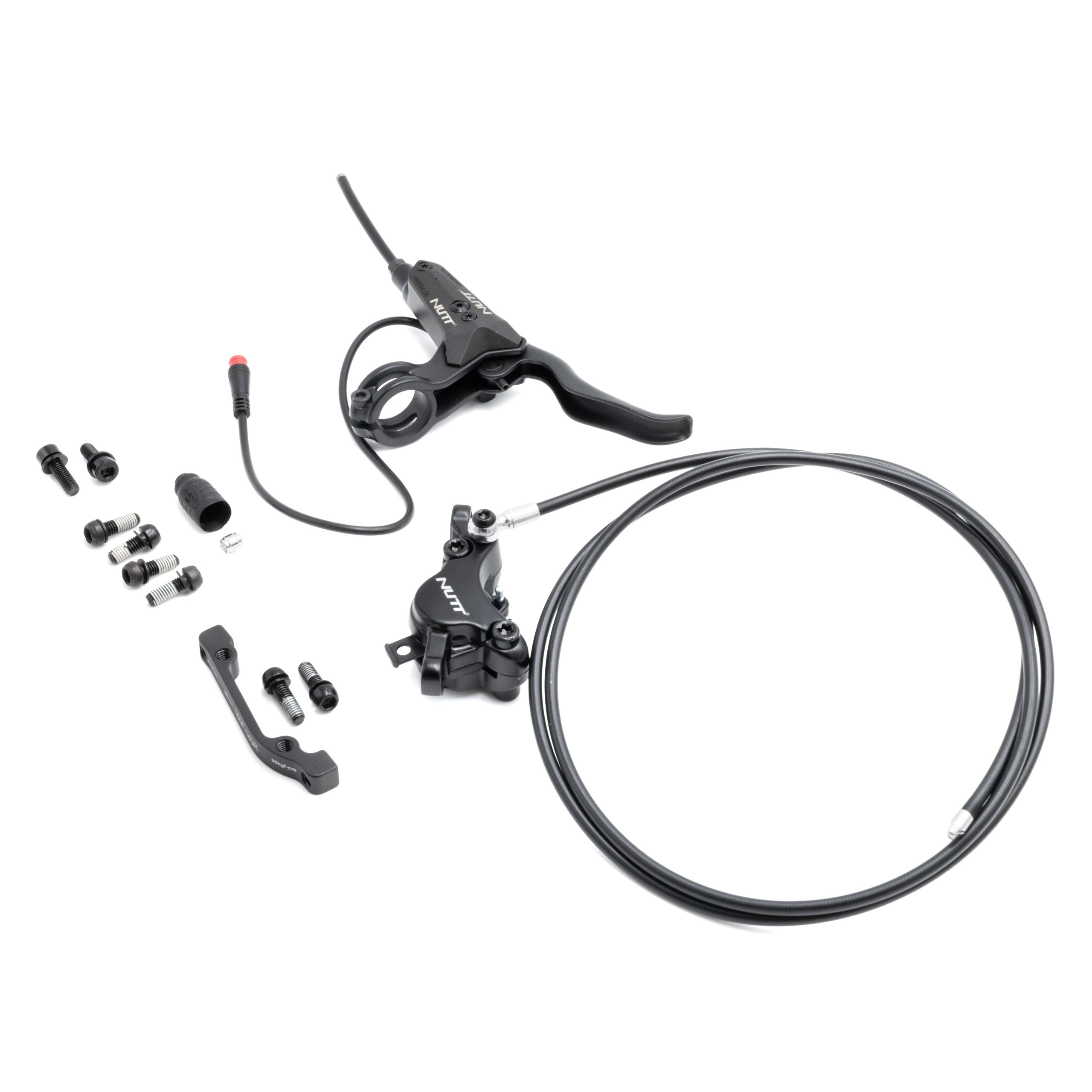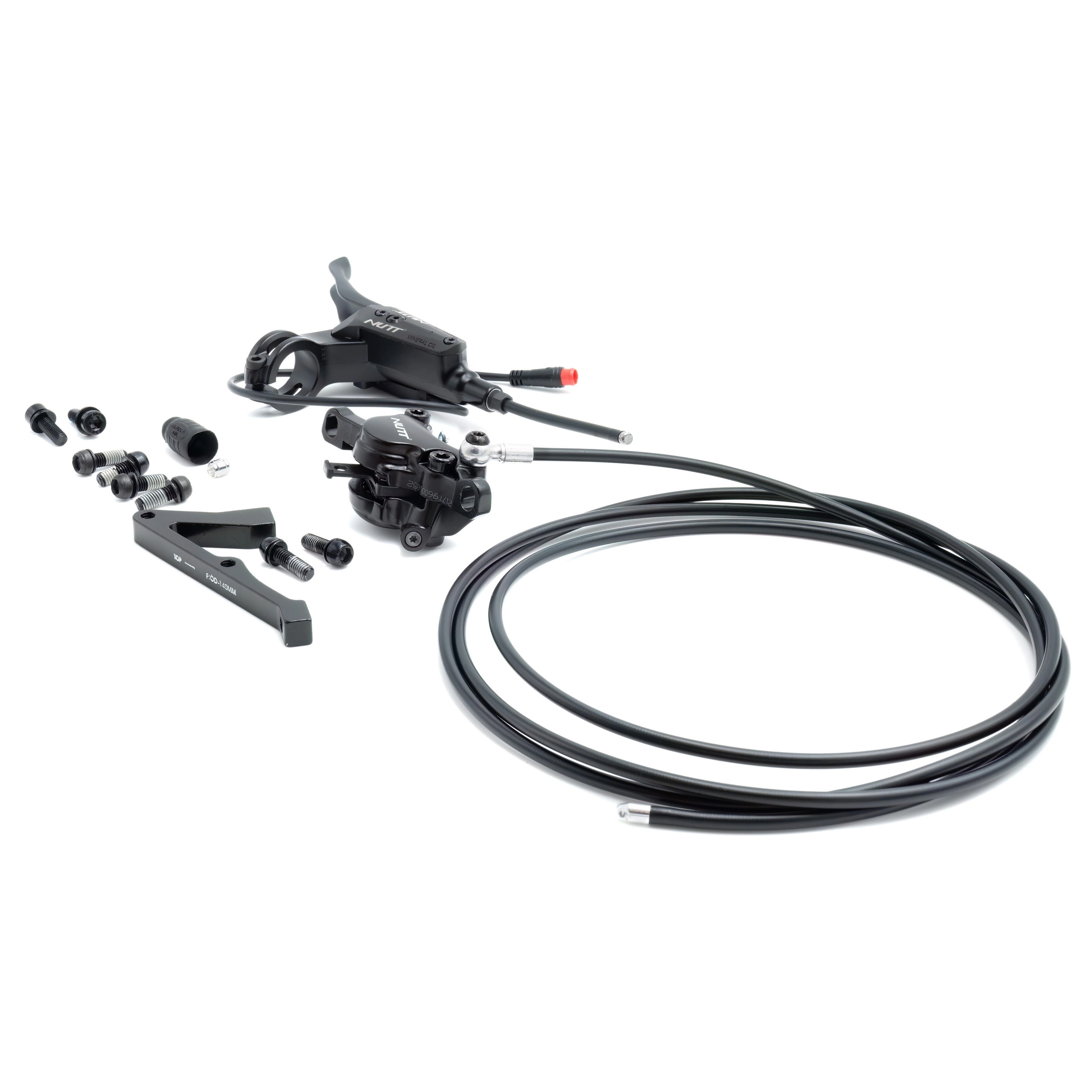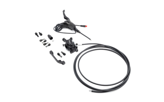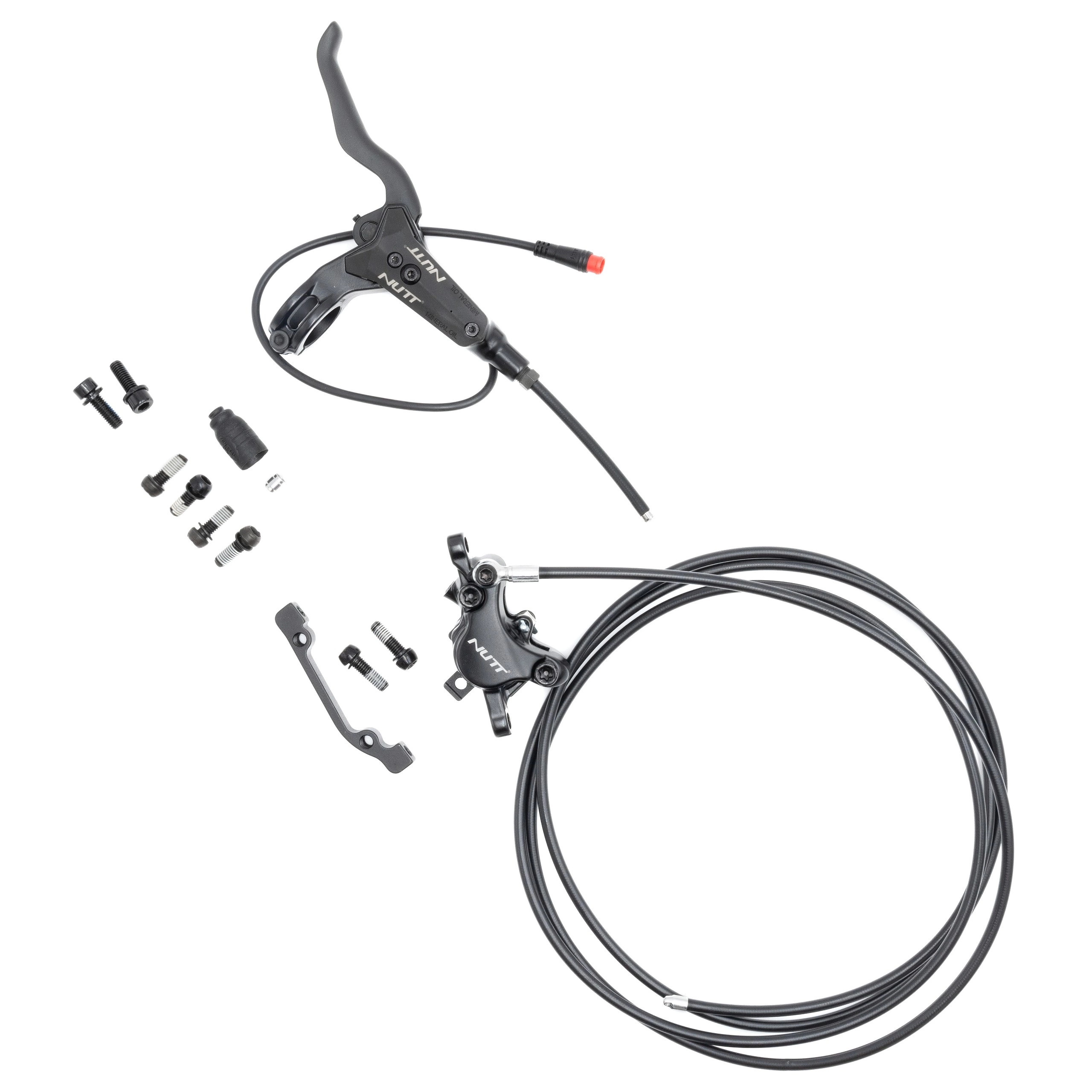 Du får en installationsklar uppsättning med ett hydrauliskt bromsok och en bromsledning från Nutt, en bromsspak med sensor och ett blockfäste för bromsfäste.