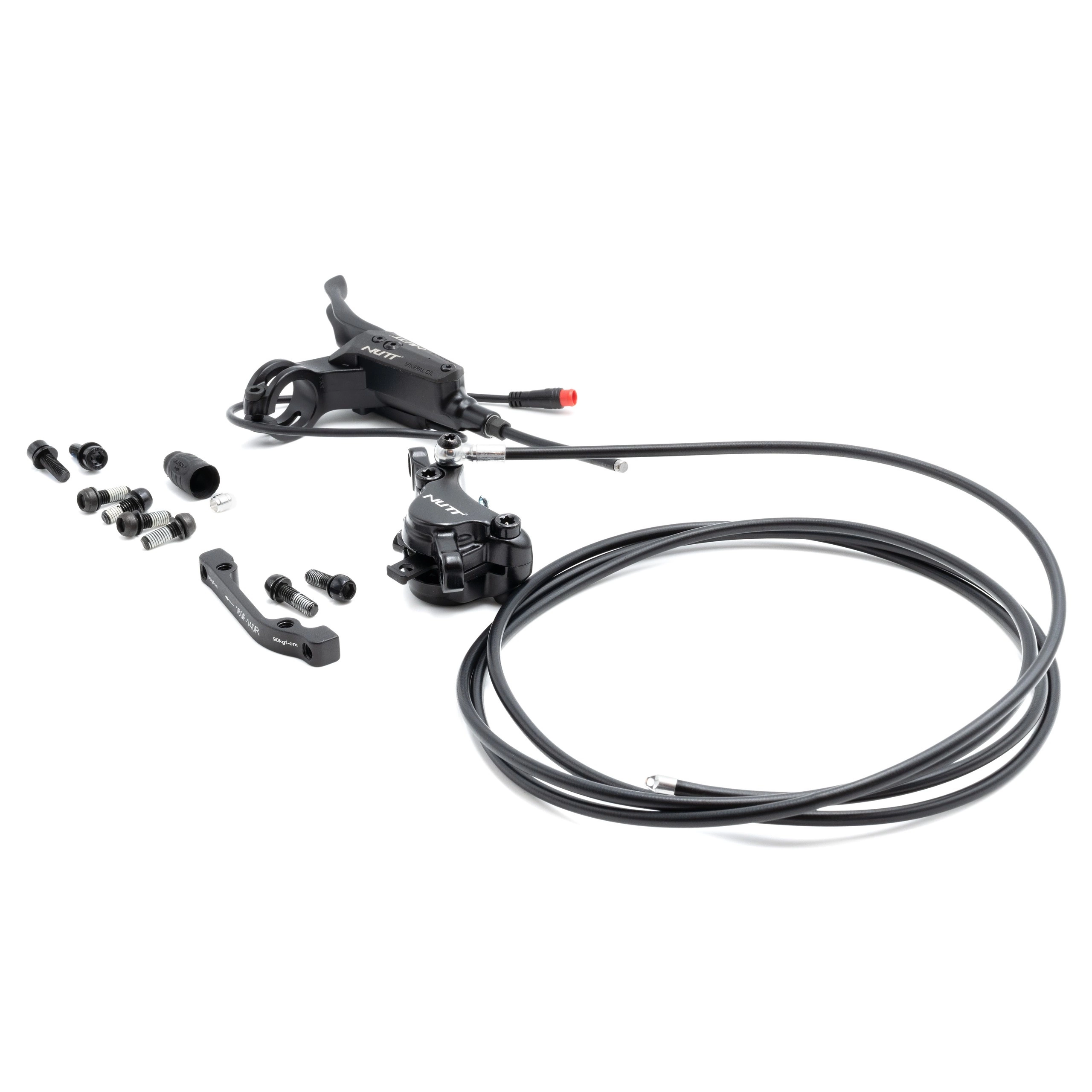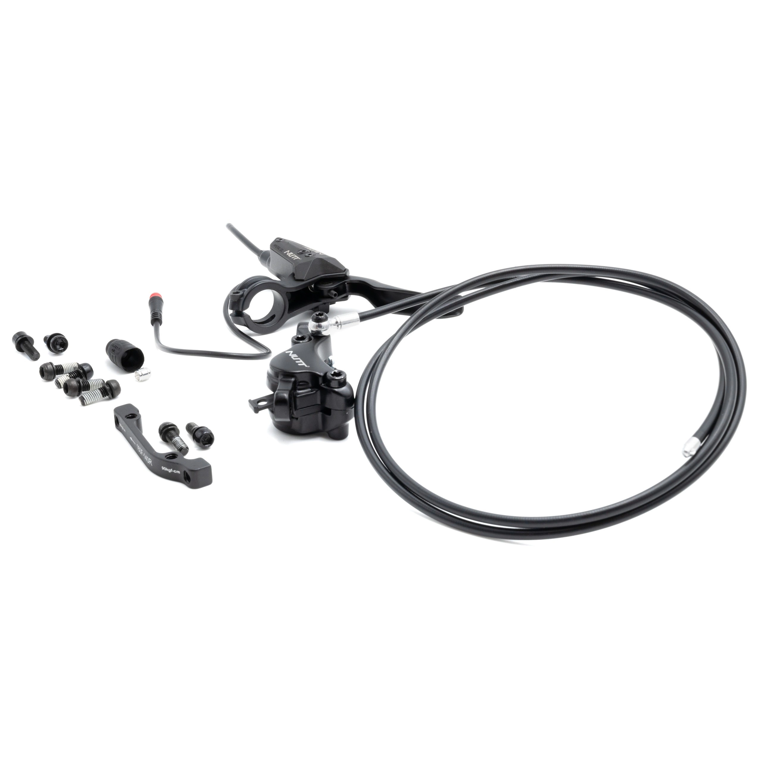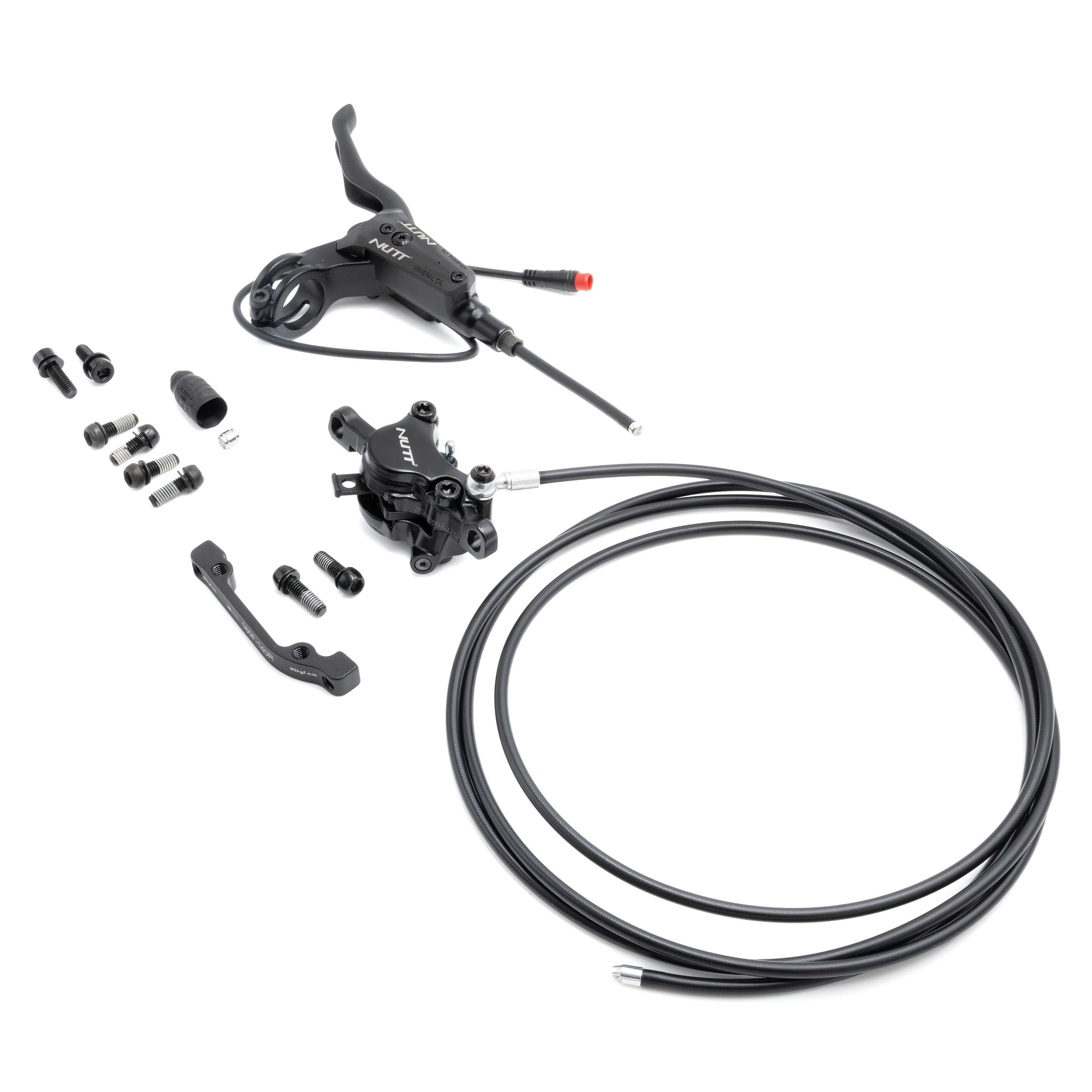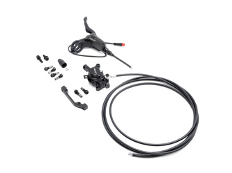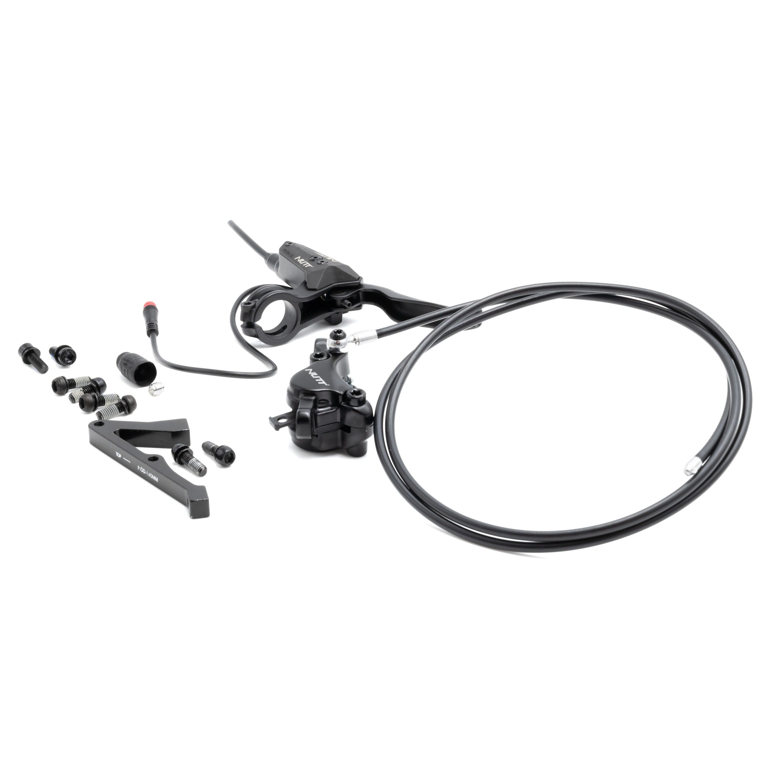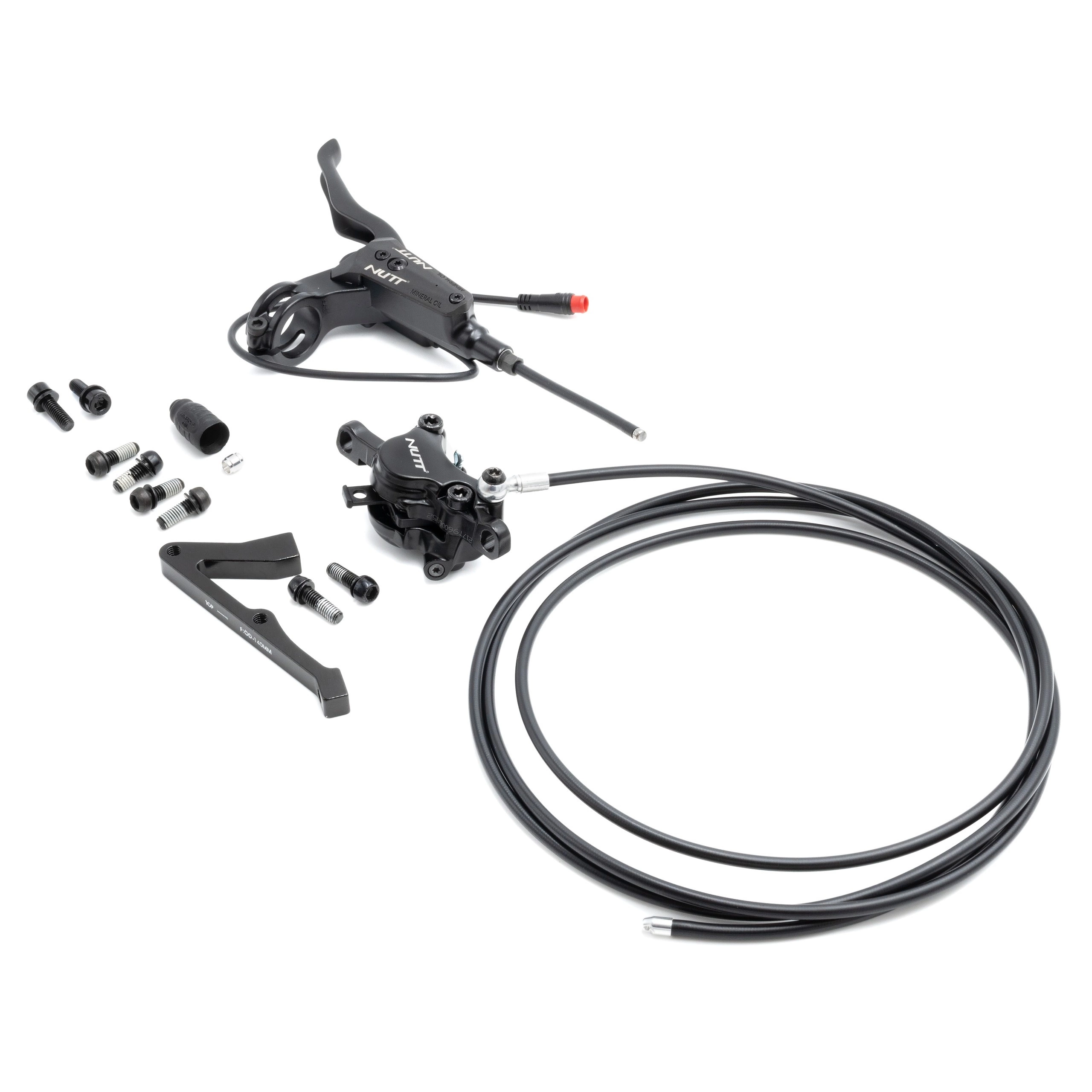 Du får en installationsklar uppsättning med ett hydrauliskt bromsok och en bromsledning från Nutt, en bromsspak med sensor och ett blockfäste för bromsfäste.