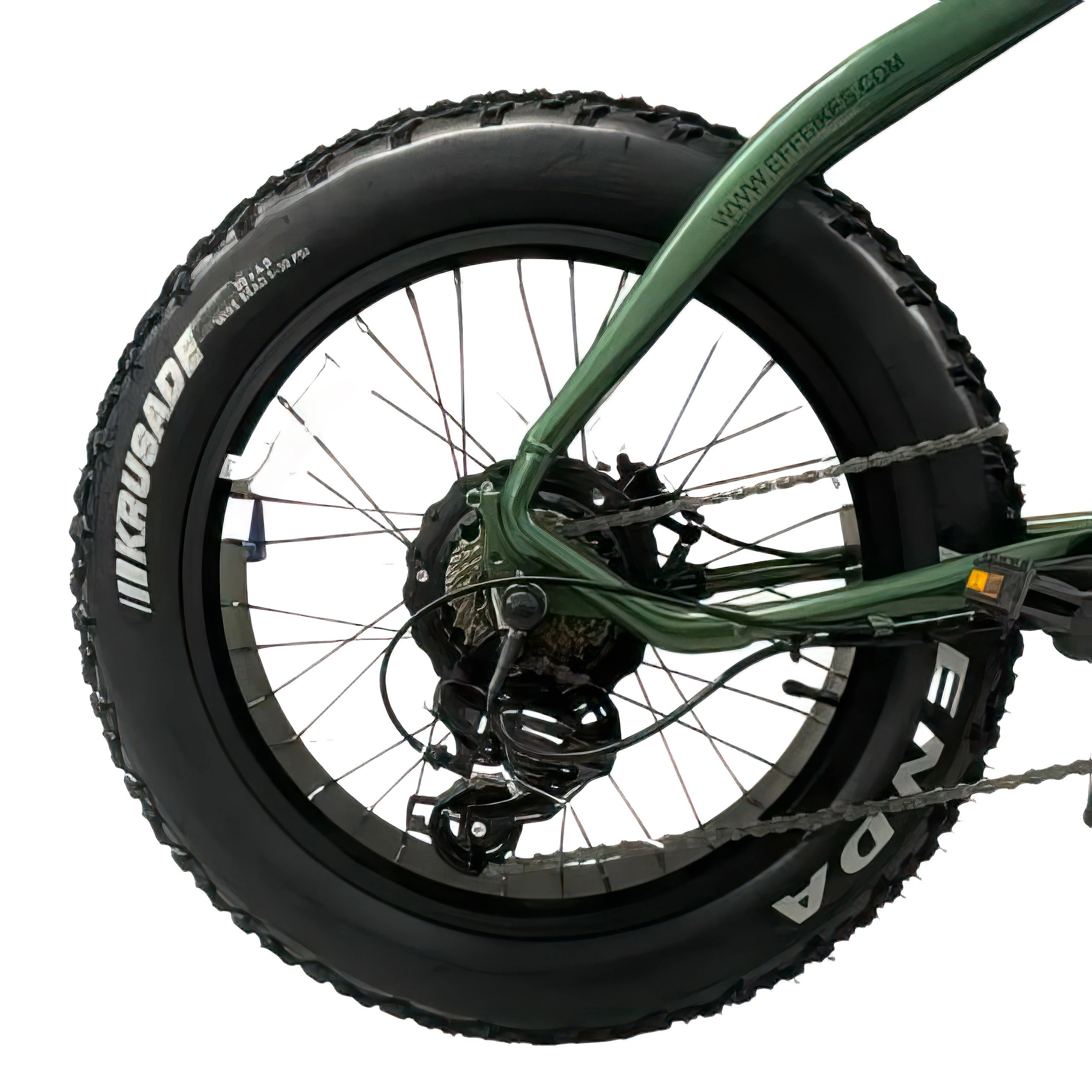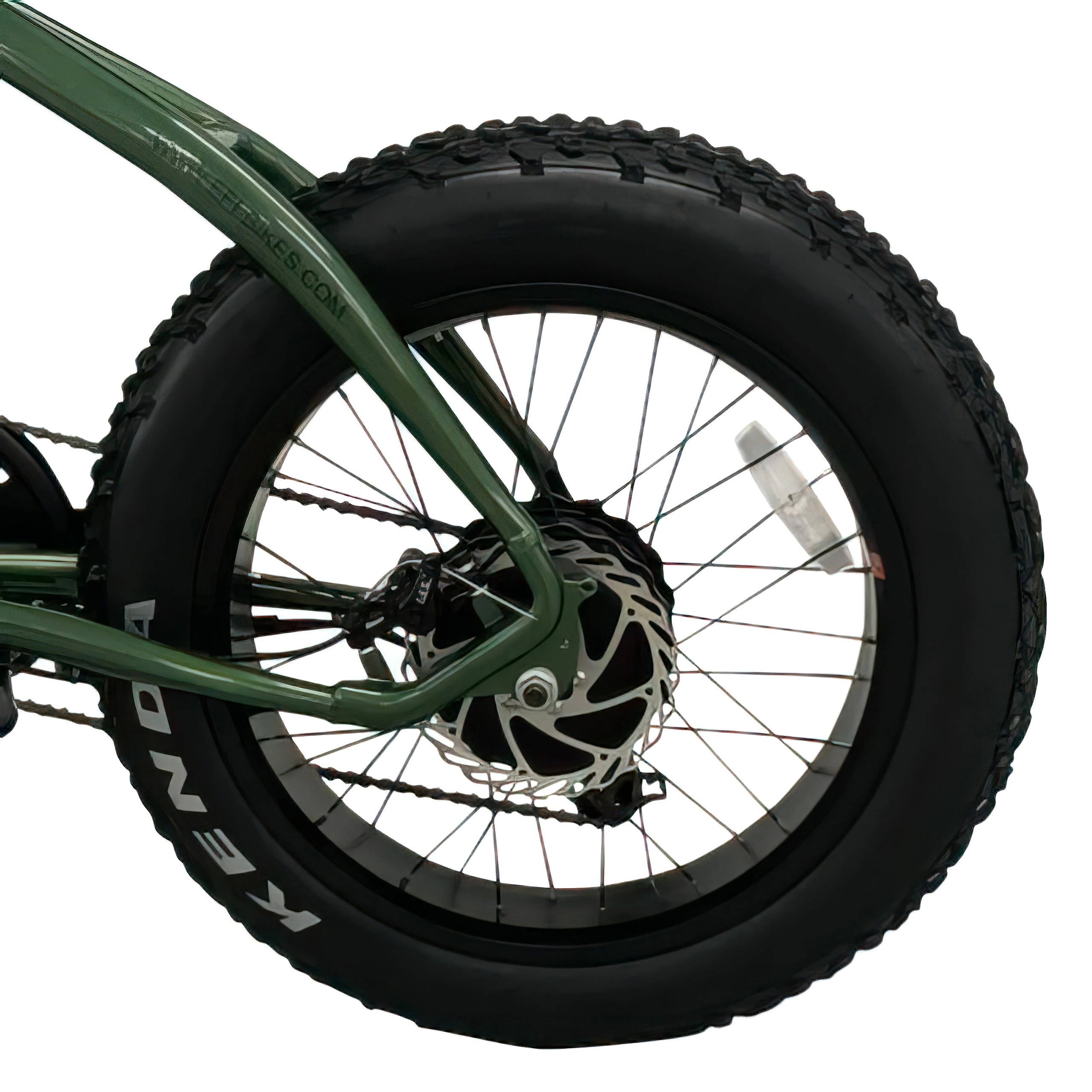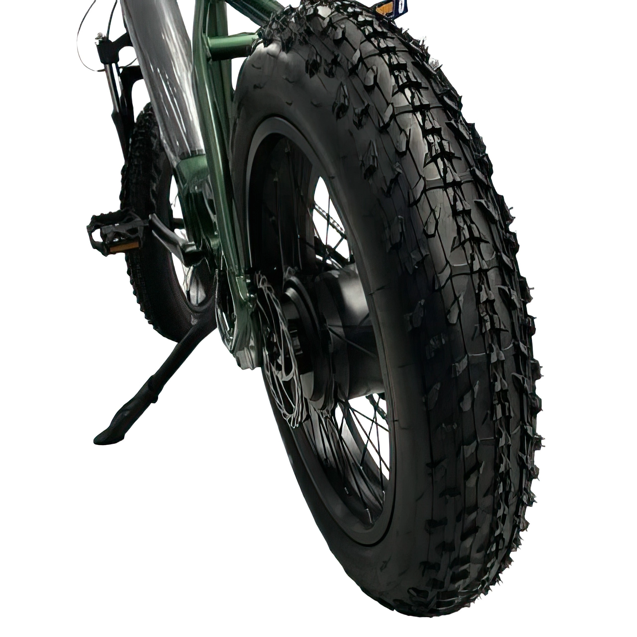 Kenda 20" x 4.0 fat-däck med bred kontaktyta ger ökad stabilitet och grepp på olika underlag. Dessa däck kompletteras med dubbelväggiga legeringsfälgar för hållbarhet och motstånd, vilket gör cykeln perfekt för både stadsturer och terrängäventyr.