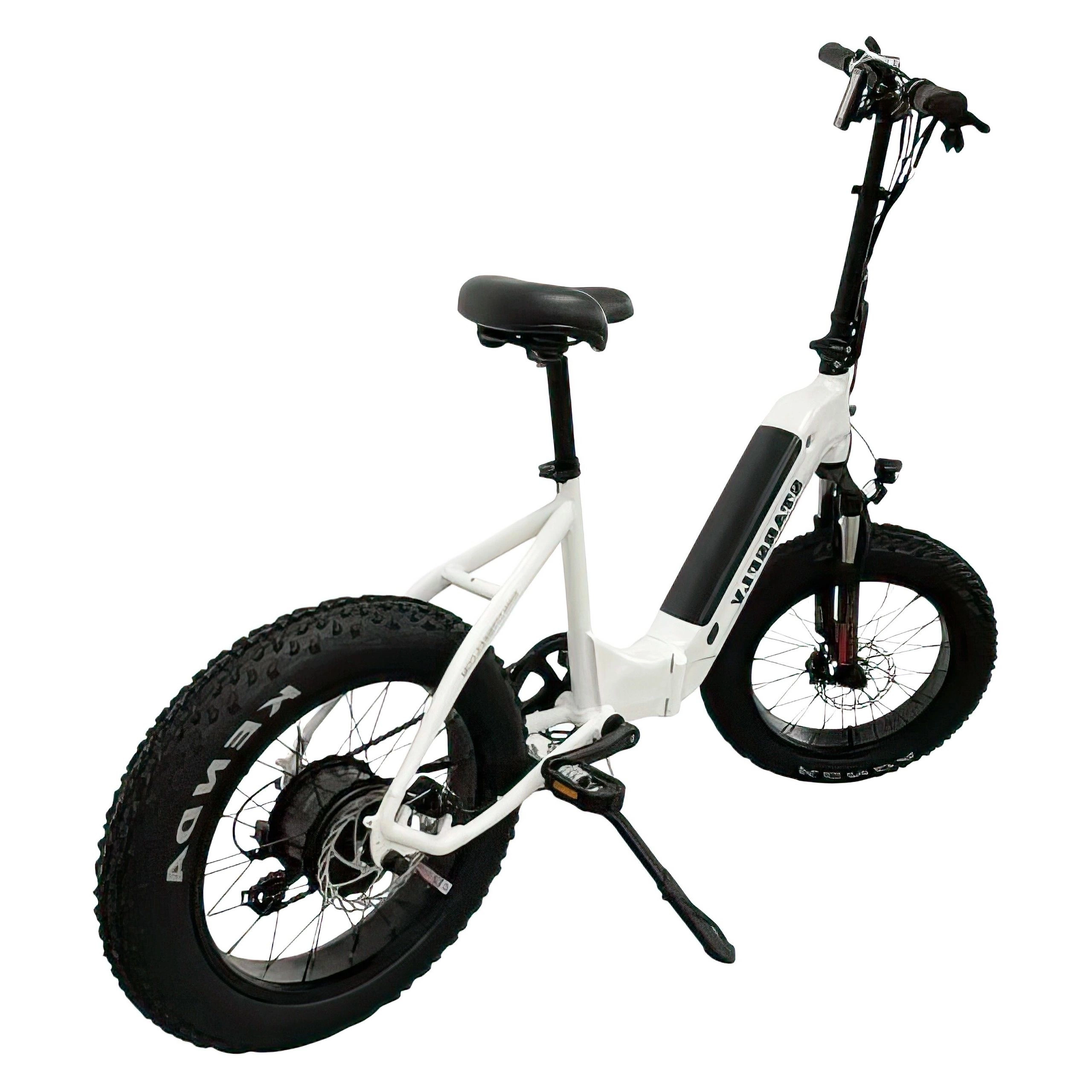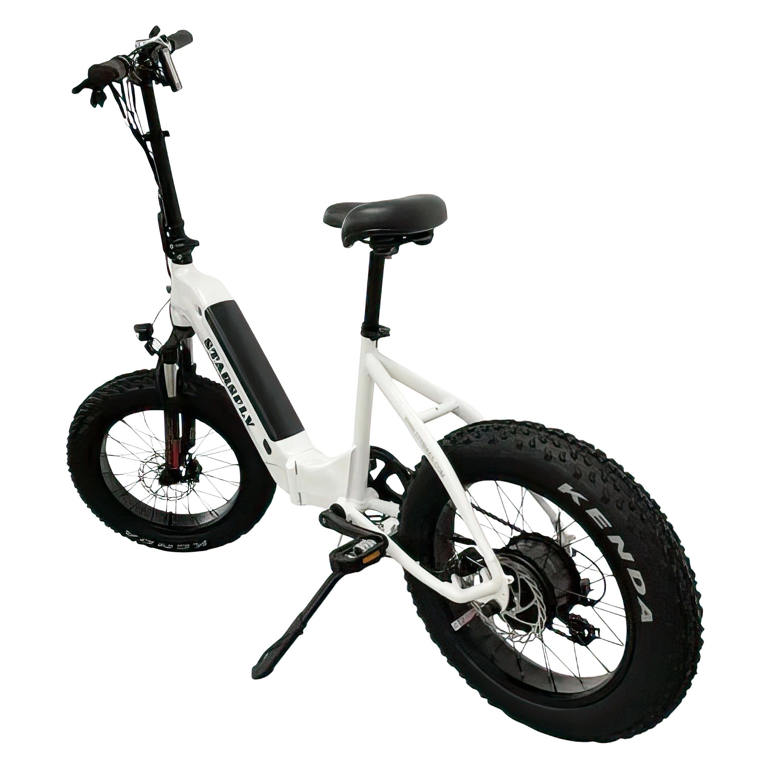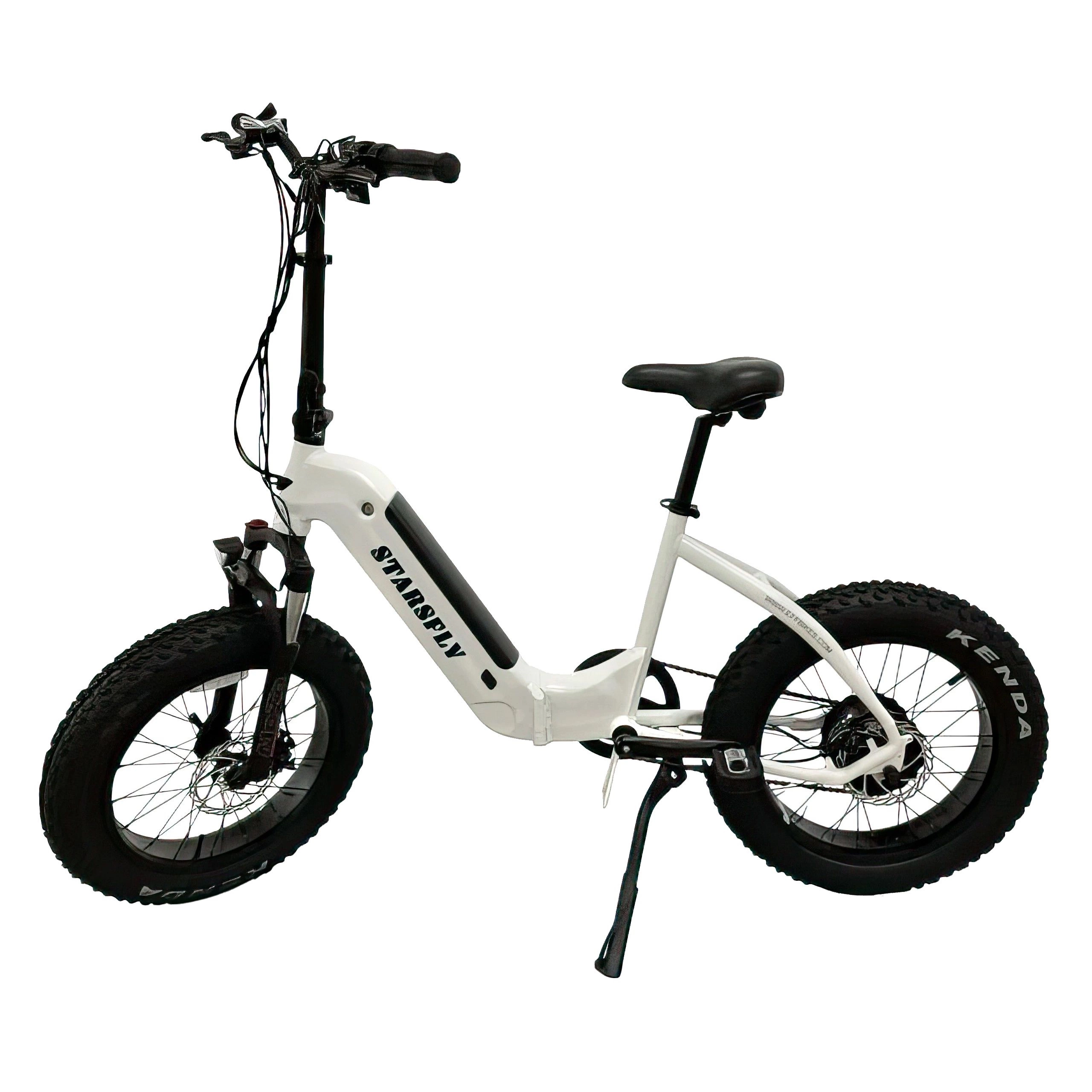 Starsfly Stepthrough Fold erbjuder både stil och komfort. Med valet av tre slående färger (svart, vit och maringrön) för att passa olika smaker blir din cykeltur inte bara funktionell utan också visuellt tilltalande. Cykelns tjocka Kenda-däck ger en terrängliknande look.