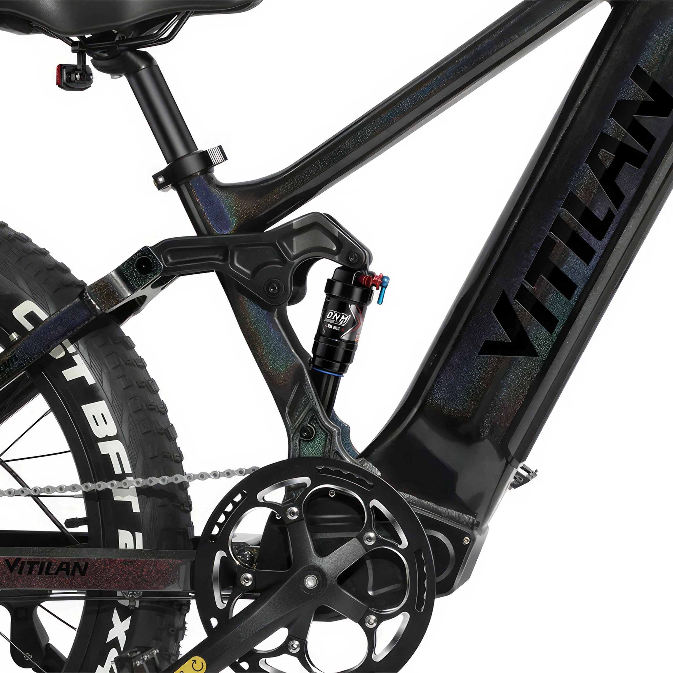 Vitilan T7 är utrustad med MOZO 26" hydrauliska dubbla fjädringsgafflar och en fyrlänkad fjädringsmekanism, vilket ger en exceptionellt smidig körning i tuff terräng. Oavsett om du navigerar på grusvägar, snöiga vägar eller ojämna bergsstigar absorberar cykelns avancerade fjädring stötar och ojämnheter, vilket förbättrar den övergripande komforten och stabiliteten.